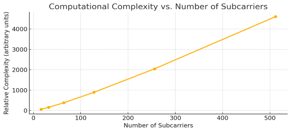 The PSD of the OFDM and FBMC signals across the same frequency range is shown in Figure 16. In contrast to OFDM, which exhibits distinctive sidelobe leakage because of its rectangular pulse shaping, the FBMC signal exhibits a sharp frequency roll-off and noticeably lower out-of-band emissions. To prove FBMC's superior spectral efficiency, this comparison is essential. In situations where stringent spectral masks must be followed, such as cognitive radio and 5G, reduced spectral leakage is essential. The Figure 16 validates one of FBMC's primary theoretical advantages by graphically depicting this behaviour and confirming that it achieves better spectral containment. The rise in relative computational complexity in relation to an FBMC transmitter's subcarrier count is depicted in Figure 17. The plotted curve exhibits a quasi-logarithmic trend, which is typical of polyphase or FFT-based filtering operations frequently employed in real-world applications. This illustration is used to examine resource needs and scalability constraints. The processing load rises with the number of subcarriers, particularly in real-time SDR environments such as the USRP N210. This analysis provides insights into the best design trade-offs for deployment by weighing the hardware feasibility against the performance benefits (as demonstrated by the BER and PSD results).