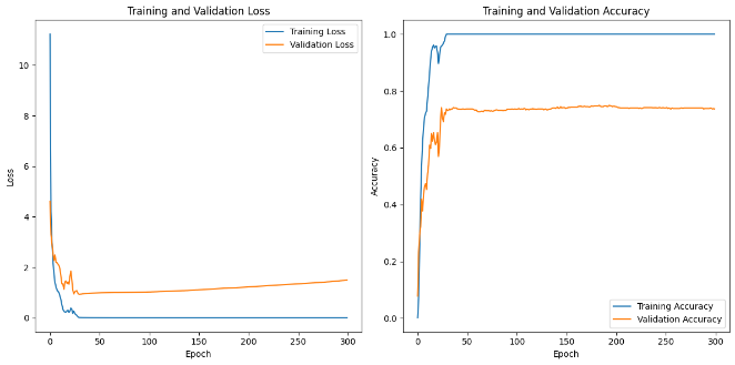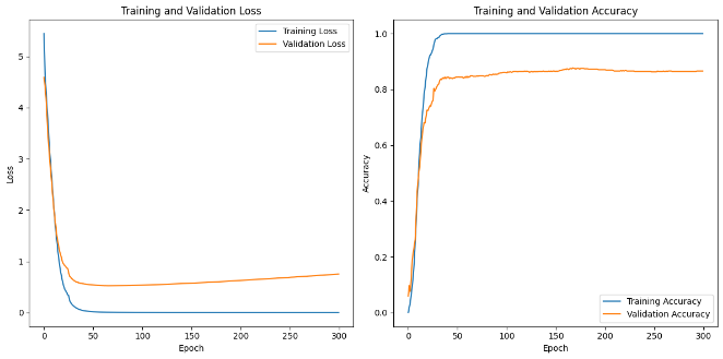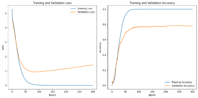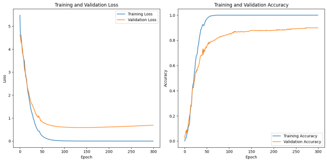 Each image is categorized by MBC for model training. This labeling is crucial for providing training data. The images are resized to 89 x 89 pixels for consistency in CNN input. Resizing is essential to mitigate discrepancies in classification. The dataset is partitioned into training, validation, and testing sets. This division follows a 70-20-10 ratio for allocation. Comprising 9,450 images across 105 MBC classes, the dataset ensures equitable distribution. Such thorough pre-processing is anticipated to improve the CNN model's training effectiveness for MBC classification. To assess the performance of various deep learning architectures in MBC classification, training was performed on a dataset of 9,450 images can be seen in Table 3. Each architecture—ResNet-50, ResNet-101, MobileNetV2, and VGG-16—was trained for 300 epochs, utilizing different batch sizes and default parameters. Critical metrics, including loss and accuracy, were evaluated for both training and validation datasets. This evaluation seeks to ascertain the model's generalization capacity and identify overfitting or underfitting. Graphical depictions of training results illustrate each model's performance trends during the training process. Figure 9 compares the training regimens, showcasing accuracy and loss over 300 epochs. The ResNet-101 model achieves over 90% validation accuracy with stability post-100 epochs, though validation loss increases, suggesting potential overfitting.