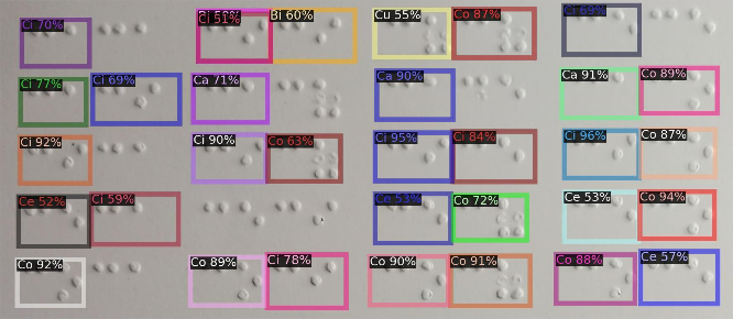 Overall, the findings of this assessment indicate that ResNet-101 represents the most superior architectural framework for the task of MBC classification within the context of this experiment. Furthermore, the amalgamation of a batch size of 32 and an epoch count of 300 constitutes the optimal configuration for achieving a harmonious equilibrium between elevated accuracy and a minimized error rate. This evaluation underscores the critical significance of selecting an appropriate architectural design and training configuration in the development of an effective and efficient image classification model. Figure 10 illustrates the output of the trained CNN model in detecting Multi Braille Characters (MBC) from a Braille sheet image. These results validate the robustness of the proposed CNN architecture—particularly ResNet-101—in handling spatial features essential for Braille recognition. Detection still has errors when there are errors in the braille dots or imperfect lighting which causes the shadow of the dots to not be formed perfectly for detection. Furthermore, the consistent accuracy across diverse syllables suggests that the model has successfully learned to generalize across the 105 class categories used in training. This detection capability marks a critical step toward the development of automated Braille reading systems that can support assistive technologies for visually impaired users.