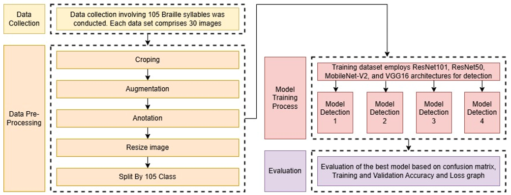 This section delineates the rigorous methodology utilized in this research. The methodology includes data collection, pre-processing, model training, and evaluation. These processes are depicted in Figure 1. The methodology comprises essential steps in data processing, modeling, and performance assessment. The following steps aim to ensure the accuracy and reliability of the model in classifying multi-Braille characters (MBC). The subsequent section provides a concise overview of each stage in the methodology.