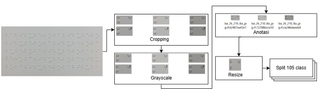 The acquired image data will be pre-processed to enhance processing efficacy can be seen in Figure 3. The first step is segmenting the Braille dataset into characters of two dots by three dots. A direct extraction method is utilized for multi-Braille characters, bypassing threshold setting. Contour detection techniques are applied on grayscale images or edge detection outputs to identify object boundaries. These detected areas may correspond to two Braille characters. Upon successful contour detection, each contour is evaluated iteratively for size and position. The MBC organizes uniform bounding boxes for cutting, linking similar character shapes. Bounding box sizes come from the average of two Braille characters in an image. This box fits within a grid structure, based on predetermined positions and intervals. To speed up annotation, each cropped image receives a class label tied to its MBC. The annotation records bounding box details, including position and size, in text or JSON formats for CNN training. Each annotation uniquely marks the MBC's position and class in the image. Labeling involves 105 MBC classes (ba,bi,bu etc.) Before feeding the images into the CNN, they are resized to meet the model's dimensions. The images are standardized to a uniform resolution, ensuring consistency in training. This resizing preserves the aspect ratio, keeping the MBC proportional. The preprocessing steps—cropping, annotating, and resizing—are vital for preparing the MBC dataset for effective CNN training.