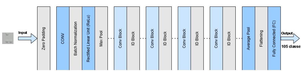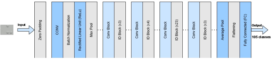 The ResNet-101 architecture illustrated in Figure 5, effectively mitigates the vanishing gradient issue in deep networks via shortcut connections. The input x is processed through a feature transformation F(x), which includes convolution, batch normalization, and ReLU activation. The output of this transformation is combined with the shortcut connection that carries original input information. To ensure dimensional consistency between input and output, a linear projection Ws is applied to the shortcut. The output of the residual block is mathematically represented as: