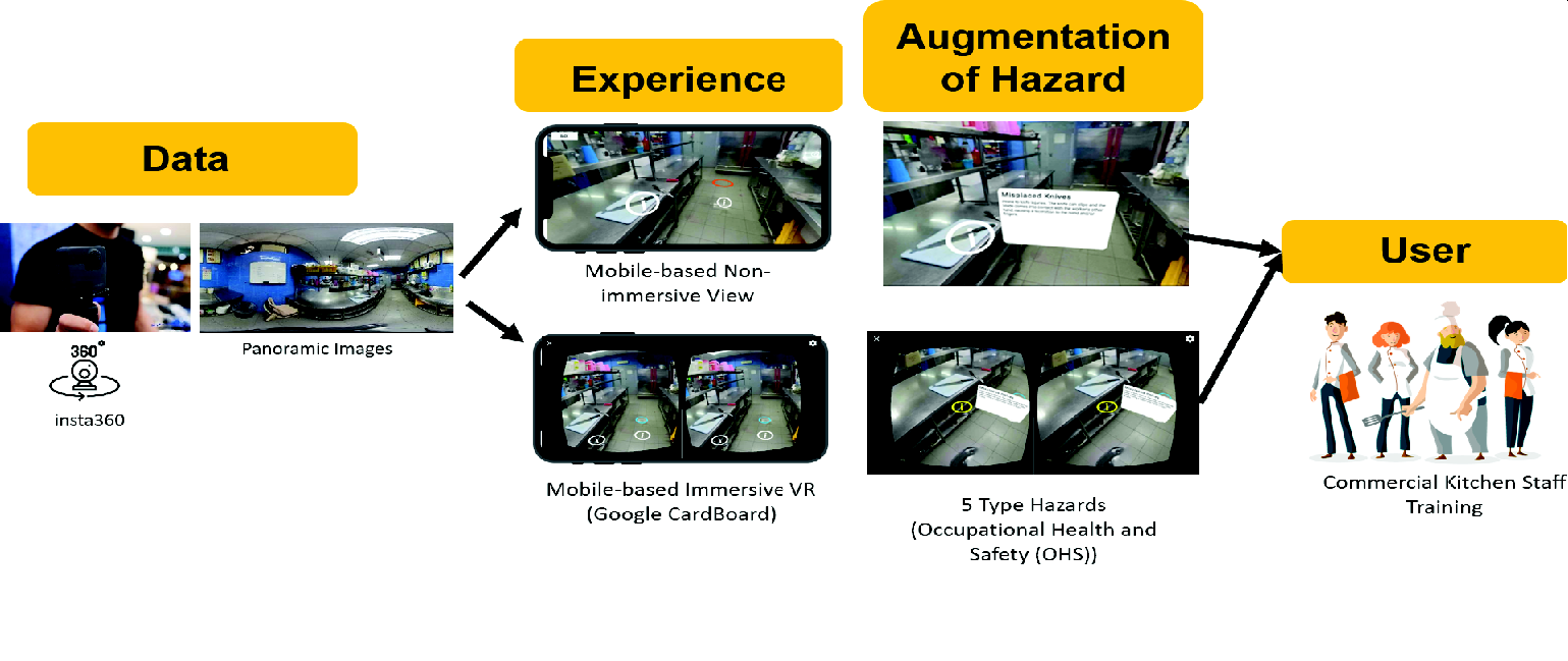 Although safety protocols and classroom-based instruction are widely implemented, their effectiveness is often questioned. Conventional methods typically rely on lectures, posters, or induction sessions that provide theoretical guidance but fail to simulate dynamic kitchen hazards. Studies show that these passive approaches lead to low engagement and rapid knowledge decay, limiting the translation of safety knowledge into workplace practice [5]–[8]. Consequently, a significant gap persists between formal safety training and practical hazard recognition in real-world contexts. Emerging immersive technologies have demonstrated potential to bridge this gap. Virtual Reality (VR) enables learners to practice hazard recognition and emergency responses in realistic yet controlled environments, improving engagement, retention, and hazard awareness [9][10]. However, fully modeled VR systems developed with 3D modeling or photogrammetry often require costly hardware such as HTC Vive or Oculus Rift, alongside high-performance computers, which makes them impractical for small businesses or community-level training programs [9].