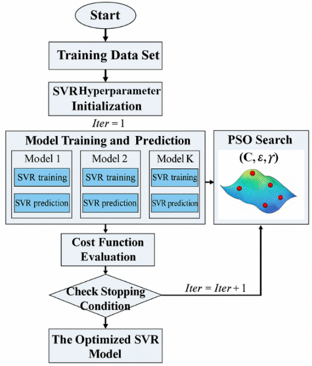 ) in search of superior configurations. Training, evaluation, and hyperparameter optimisation using PSO are used in this loop, which recurs, and there is a counter of recursion in every loop. It stops once a form of restriction position is achieved, which is set beforehand, where the personalised SVR model is completed. Such a recurrence structure will exploit the capabilities of the SVR in strong prediction and PSO in global discovery efficiency and avails coordination to create a high-tuned forecast model [38].