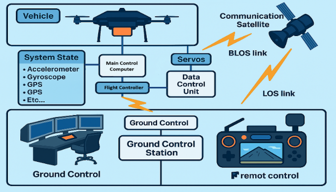 In this section, an advanced model of machine learning-based control, which has the objectives of promoting the adaptability, accuracy, and stability of the UAV systems, is presented. The conventional UAV control systems usually utilise fixed-parameter controllers that could only be tuned manually, and thus the performance of the system may degrade when there is a prevalent and abrupt change in the flight scenario or due to high levels of external disturbances, such as wind gusts, payload influences, sensor noise, etc. These drawbacks impair the immediacy and independence of the UAVs, especially during scenarios in which the mission is crucial, like surveillance, delivery and environmental supervision [47][48]. In order to overcome these constraints, the new framework of control, proposed here, makes use of SVR to develop a model of the highly nonlinear parts of the control input-output relationships (e.g., throttle, pitch, yaw) to control outputs (e.g., position, velocity, orientation). VR can be best applied to this application because it does not require large feature sets to generalise, or a collection of a large number of noisy samples in training, factors that are very common in real flight control onboard systems. Yet, the predictive accuracy of SVRs is very sensitive to the choice of their hyperparameters, such as the regularisation constant (), parameters of the kernel function, and the epsilon-insensitive loss threshold [49]. Improper settings of such values may result in undesirable performance of the control [50]. To surpass this shortcoming, ES-PSO is used as a worldwide optimisation algorithm for automatic parameter fine-graining. An advantage of the EES-PSO is the possibility to perform the exploratory search characteristic of the Eagle Strategy and to achieve the convergence by fine-tuning the resultant to the PSO. This combination can offer dynamic, adaptive adjustment of the SVR hyperparameters at the real-time level within the controllers and an overall flexible and highly responsive control model that adapts to the given conditions with dynamic flight settings and continuously re-learns its output. To bring practicality to this framework in UAV system design, the whole architecture and flow of communication within a typical UAV control system are depicted in Figure 2. whereas, Figure 2(a) shows the internal connections and signal routing of a quadcopter and the most important components of input and output, with which connection to the flight controller [50]-[58]. While, Figure 2(b) enlarges the illustration to illustrate the communication path between the satellite, ground control, as well as between the UAV and its operators through the transmission and reception of command and telemetry information. Figure 2(c) explains a visual following and guidance case study involving dual Pan-Tilt Unit (PTU) units with image processing that illustrates the need to have accurate control of the angle as part of an autonomous landing or target-tracking on an UAV. Figure 2(d) gives a block diagram of onboard UAV electronics, focusing on the close coupling of sensors, controllers, and actuators in real applications to helical UAVs. All these subfigures will give a complete graphical ground to the application of the ES-PSO-based control model on the application of the ES-PSO-based control model in various UAVs. The hybrid strategy has the advantage of obviating the requirement that the UAV pilot manually tune parameters or utilise preset nominal gains in PID control, and can even be used in the creation of self-optimising UAV platforms that can fly safely and efficiently in unfamiliar, unstructured environments. Such a combination of machine learning and swarm-based optimisation provides a way to create smarter and more autonomous, and robust aerial systems.