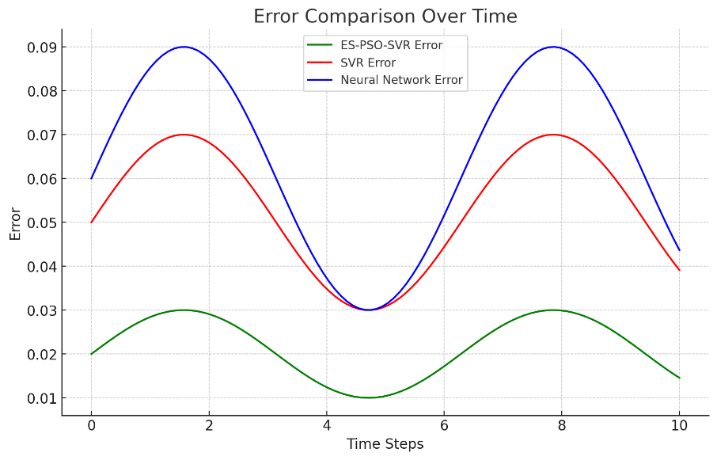 In order to further assess the soundness and steadiness of the ES-PSO-SVR model, Figure 4 illustrates the error (e.g. RMSE) comparison in time. This plot illustrates that the ES-PSO-SVR scheme shows to have a stable, very low error over different time points, implying that the scheme can be applied to dynamic UAV control systems with ease. Comparatively, such models as Naive Bayes and KNN exhibit greater variation in error over time, which is evidence of less sustained options under varying circumstances. This stability in performance indicates that the fact that ES-PSO-SVR model can be used in real-time applications.
