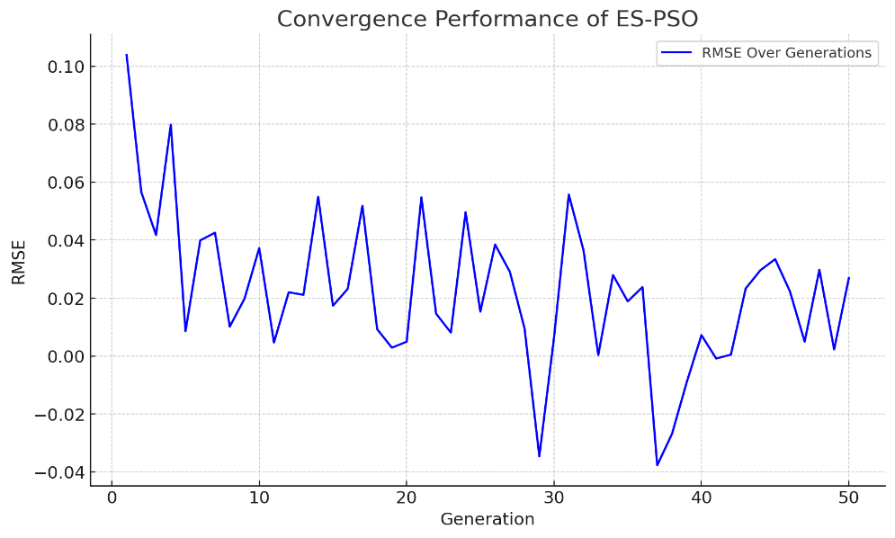 The main concern in the optimisation of the ES-PSO-SVR model is the optimisation process. Figure 6 shows the divergence pattern of the ES-PSO algorithm as the generations come and go. As the number of generations grows, the mentioned Figure 6 indicates a consistent decrease in RMSE, indicating that this algorithm is minimising errors with the help of iterative optimisation. This convergence trend indicates the effectiveness of the ES-PSO algorithm in optimising the hyperparameters of the SVR model, which leads to better predictive power.