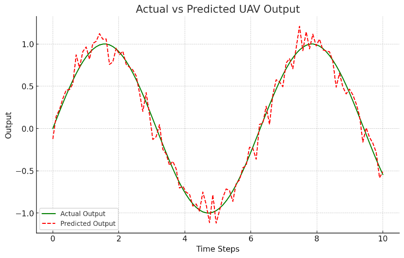 Figure 5 contains a plot which compares the actual UAV control outputs with those that are predicted by the ES-PSO-SVR model. The model can be used to closely monitor the actual outputs, indicating how well it can predict the success of UAVs' reaction in real-time. The limited oscillation between the actual and the predicted outputs is additional evidence of the accuracy of the ES-PSO-SVR model, especially in the complex and dynamic flight conditions. The capability of this model to uphold this degree of precision in various scenarios renders this model extremely reliable for autonomous UAV systems.