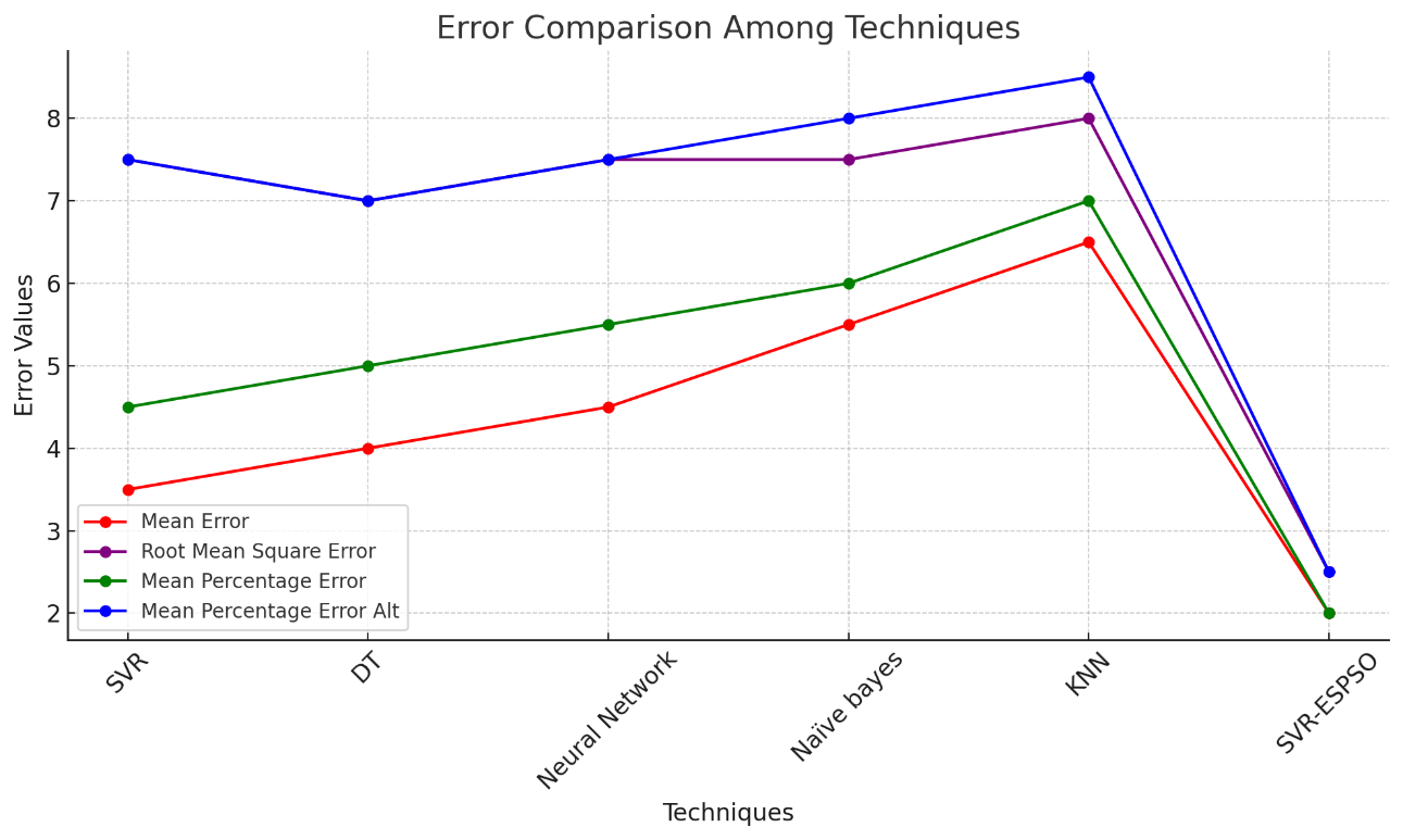 Here we provide the outcomes of performance analysis of the proposed ES-PSO-SVR model and compare the performance of the model with the other machine learning models, including standalone SVR, Decision Tree (DT), Neural Networks, Naïve Bayes and K-nearest neighbours (KNN). We use the important evaluation parameters Measure of Error (ME), Measure of Percentage Error (MPE) and RMSE to evaluate the accuracy of the prediction of the model. The organisation of the discussion is aimed at showing how efficient the ES-PSO-SVR model is in different settings.