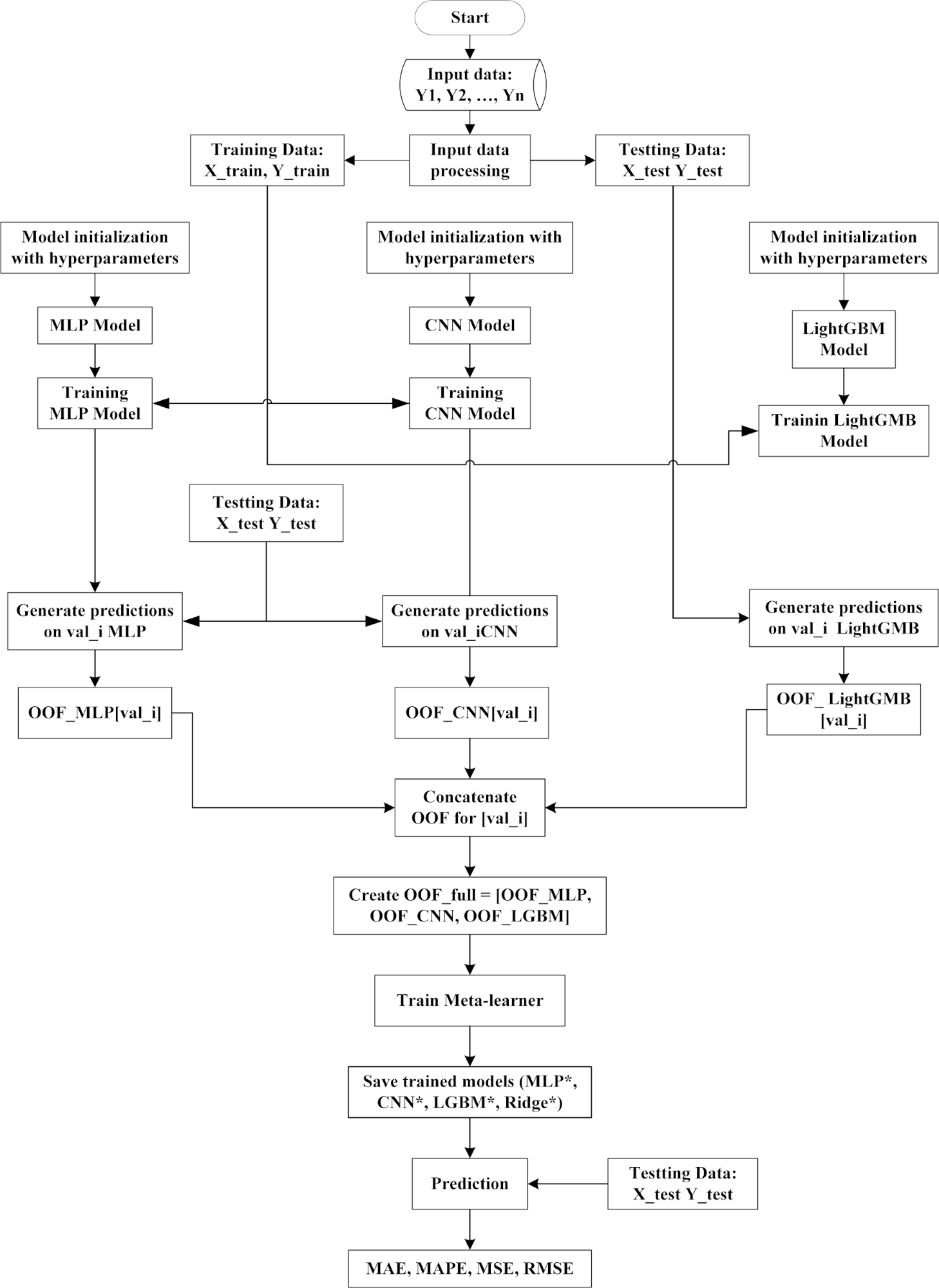 The dataset is then divided into training and testing sets. Three base learners—Multilayer Perceptron (MLP), Convolutional Neural Network (CNN), and Light Gradient Boosting Machine (LightGBM)—are initialized with their respective hyperparameters and trained independently. Predictions are generated on validation subsets using a 5-fold TimeSeriesSplit cross-validation strategy, producing out-of-fold predictions (OOF_MLP, OOF_CNN, OOF_LightGBM). These OOF predictions are concatenated into a meta-feature matrix (OOF_full), which is used to train the Ridge regression meta-learner. At the end of this stage, all trained models (MLP, CNN, LightGBM, and Ridge) are saved for later use. In inference, the saved base learners generate predictions on the unseen test set. These predictions are stacked and passed to the Ridge meta-learner, which outputs the final forecasts. The predictive accuracy of the framework is then evaluated using four standard error metrics: Mean Absolute Error (MAE), Mean Absolute Percentage Error (MAPE), Mean Squared Error (MSE), and Root Mean Squared Error (RMSE).