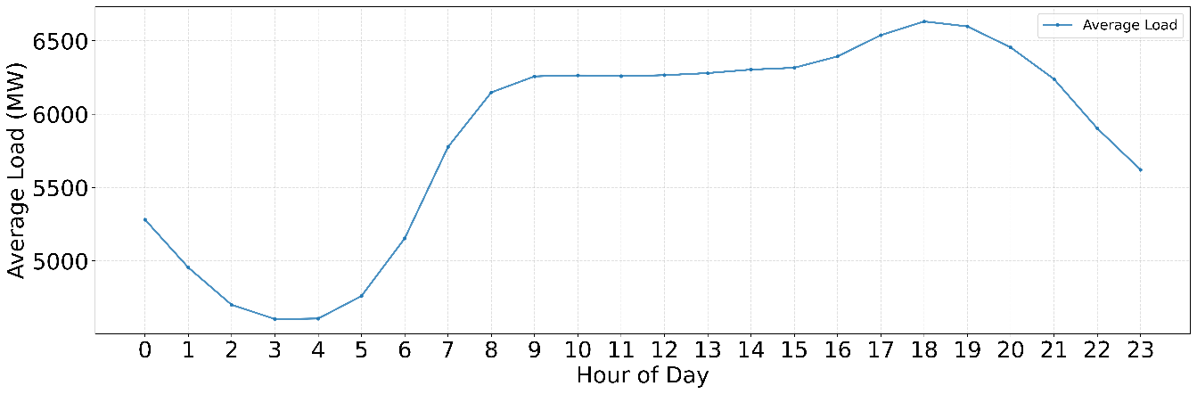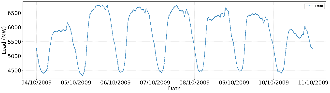 These values confirm significant intraday fluctuations and the presence of pronounced peaks. The average daily load profile of Queensland is depicted in Figure 2. Figure 2 shows the average daily load curve, highlighting a strong day–night cycle. Demand decreases to a trough of 4.6–4.7 GW in early morning hours (03:00–04:00) and then rises sharply during 05:00–09:00, stabilizing at ~6.2–6.3 GW midday. A second ramp occurs between 16:00 and 19:00, forming the evening peak at ~6.6 GW, roughly 0.8 GW above the plateau. After 20:00, load declines steadily to ~5.6 GW at midnight. This pattern—marked by a pre-dawn valley and an evening peak—indicates that forecasting models must prioritize accuracy during 17:00–20:00 when operational risk is highest. A one-week sample of the load time series is shown in Figure 3. Figure 3 illustrates a 7-day sample of the load series (04–10 Oct 2009), showing regular diurnal patterns. Daily amplitudes reach ~2.1–2.3 GW, with consistent morning up-ramps and evening peaks around 6.6–6.8 GW. Day-to-day variability is relatively small (<≈5%), but weekends exhibit slightly lower midday levels. These observations justify the inclusion of hour-of-day and day-of-week features in the forecasting models.