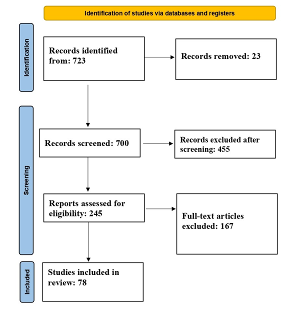 The process of filtering the literature for this systematic review is summarized as follows and is visually represented in Figure 1. Initially, 723 records were identified through database searching. After removing 23 duplicate records, 700 unique records proceeded to title and abstract screening. Based on relevance criteria, 455 records were excluded at this stage. The remaining 245 full-text articles were then assessed for eligibility, leading to the exclusion of 167 articles due to reasons such as lack of original data, insufficient benchmarking, or irrelevance to lightweight cryptographic algorithms for IoT. Ultimately, 78 studies met all inclusion criteria and were incorporated into the qualitative synthesis. The systematic process by which relevant studies were identified, screened, assessed, and selected for inclusion in this review is illustrated in the Figure 1.