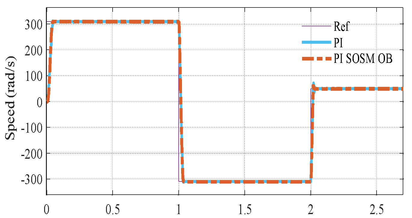 s, while the rotor speed is regulated at a constant value of 310 rad/s throughout the experimental evaluation. Figure 3(a) to Figure 3(c) illustrate the corresponding speed tracking performance. Although both controllers successfully track the reference trajectory, their accuracy varies considerably, as evidenced by the tracking errors in Figure 3(b) and Figure 3 (c). The proposed PI–SOSM–OB control strategy demonstrates superior performance by maintaining the smallest tracking error, particularly during dynamic transients such as acceleration and speed reversal. Conversely, the conventional PI controller shows more pronounced deviations, thereby indicating reduced tracking accuracy. Figure 3(b) illustrates the disturbance rejection performance. The main advantage of the proposed method is clearly highlighted in this figure. As shown in Figure 3(b) to Figure 3(d), when a sudden load torque of 7 Nm is applied, both PI and PI–SOSM–OB control strategies experience a speed drop of about 58 rpm (19.3%), but the PI controller exhibits slower recovery and larger steady-state error. Figure 3(d) further confirms that the proposed system achieves a rapid and highly accurate torque response. . In addition, Figure 3(e) and Figure 3(f) illustrate the control effort (