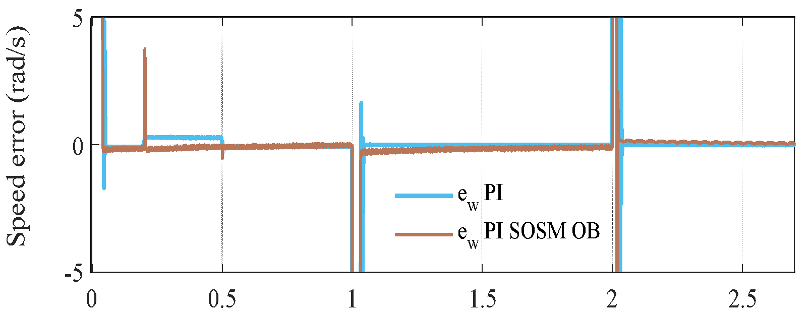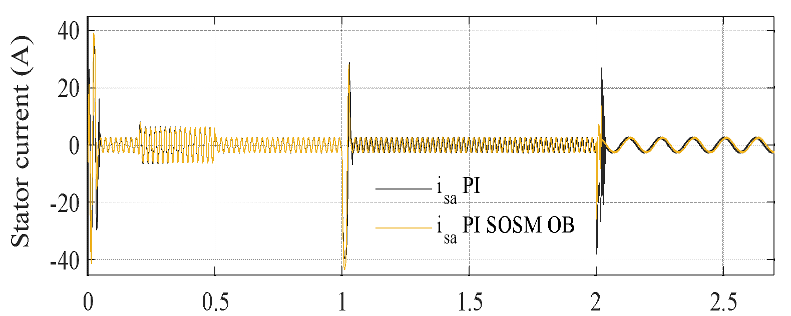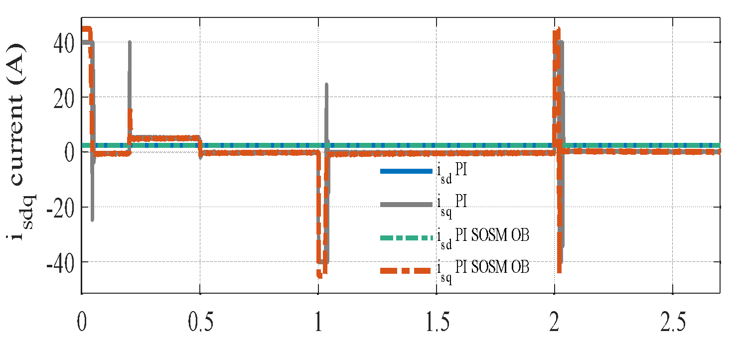 ) for the two strategies, revealing that the PI–SOSM–OB approach provides a more decisive and faster current response, thereby enhancing disturbance rejection capability.