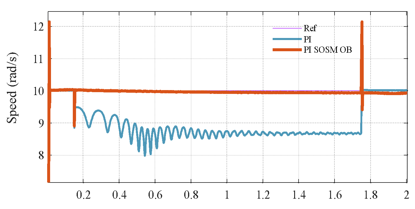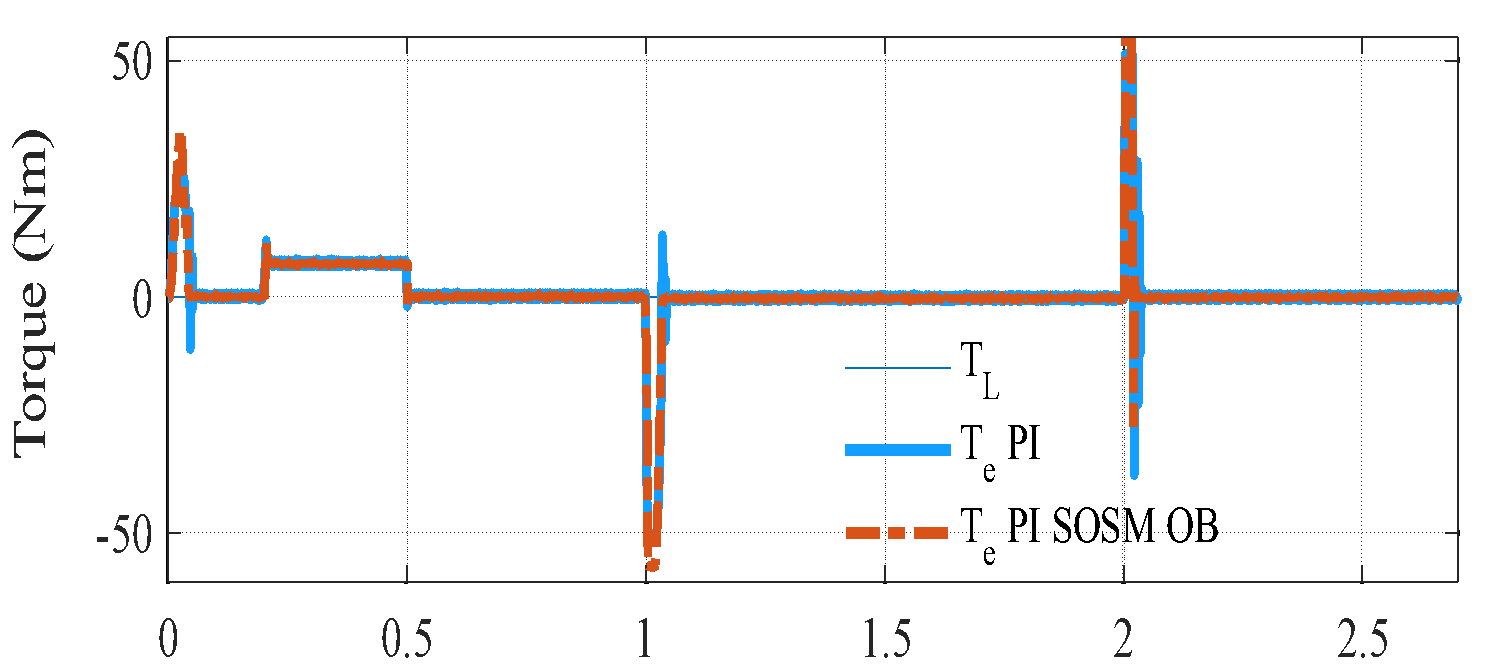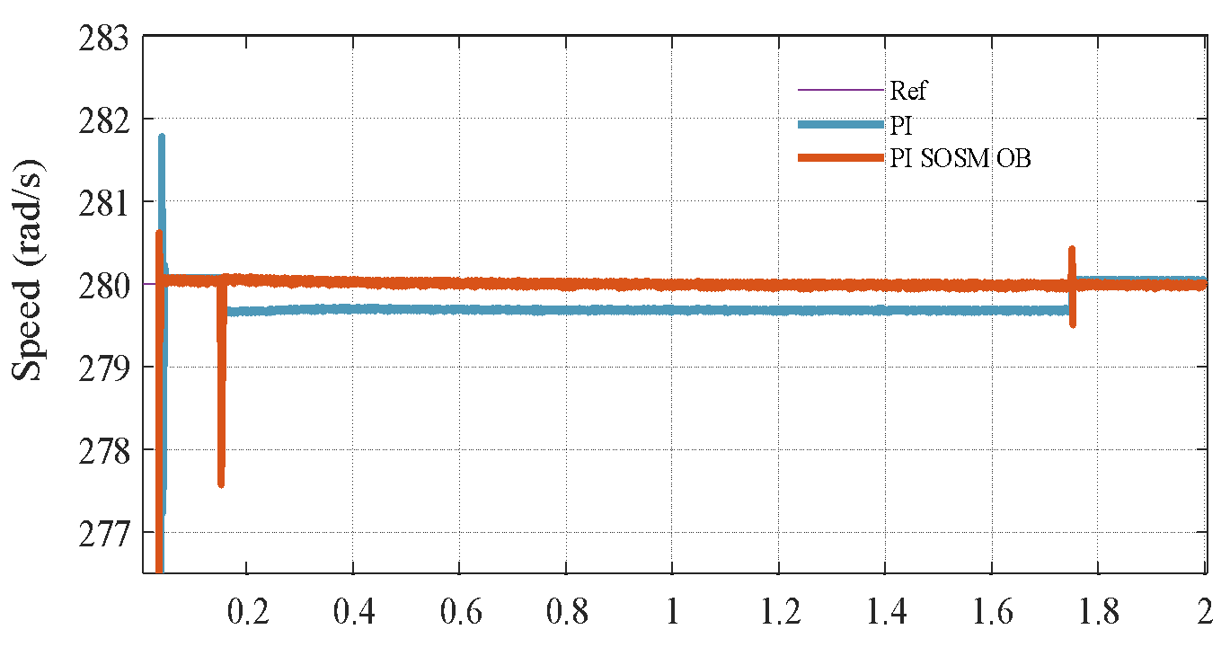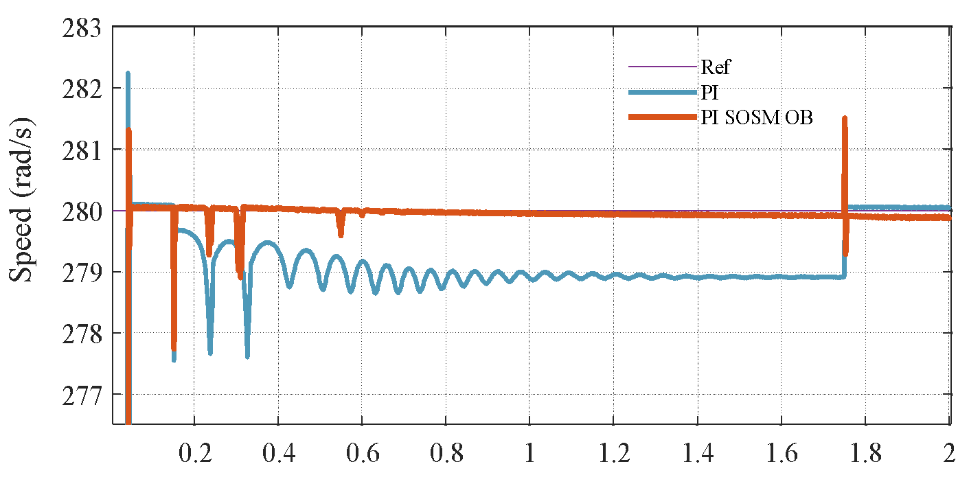 , and the closed-loop poles shift due to the change in mechanical dynamics. Specifically, the mechanical subsystem responds more sluggishly, leading to poor speed tracking and larger steady-state deviations during transient events. In contrast, the proposed PI–SOSM–Observer strategy maintains excellent dynamic performance despite the change in