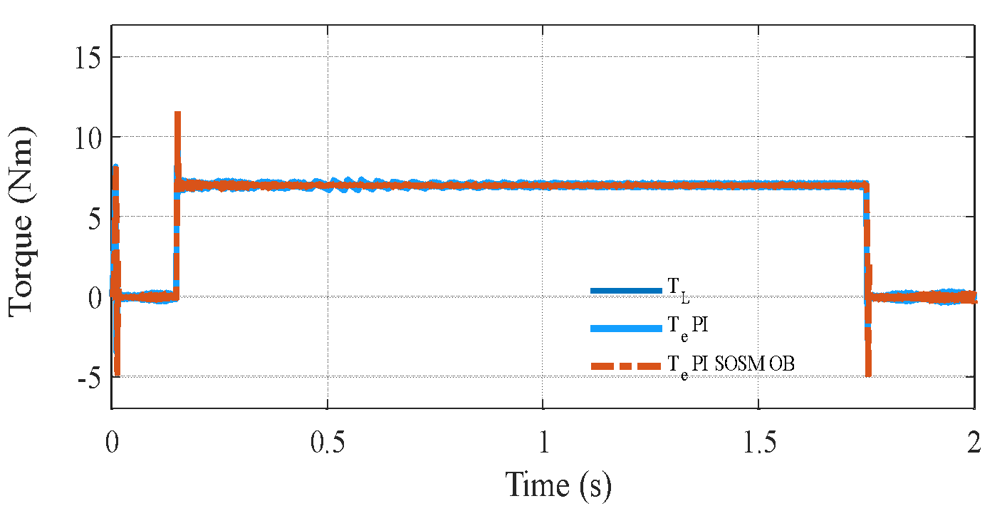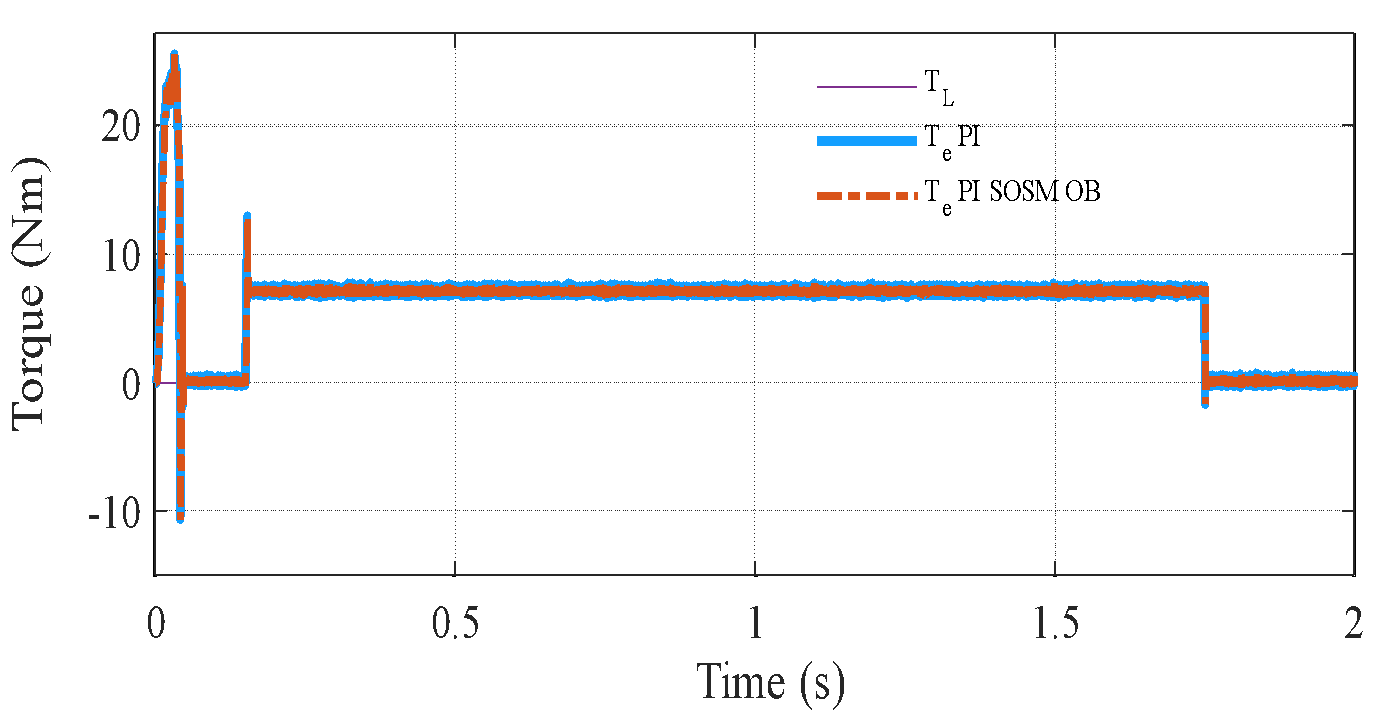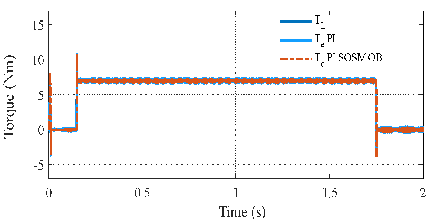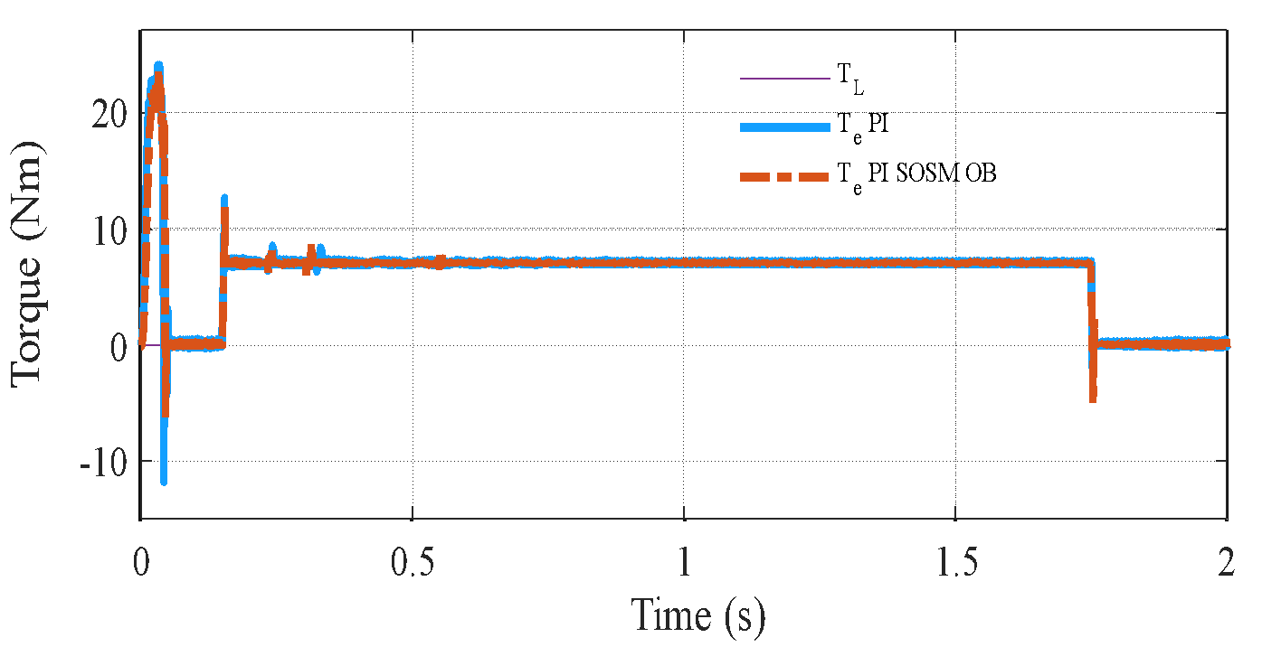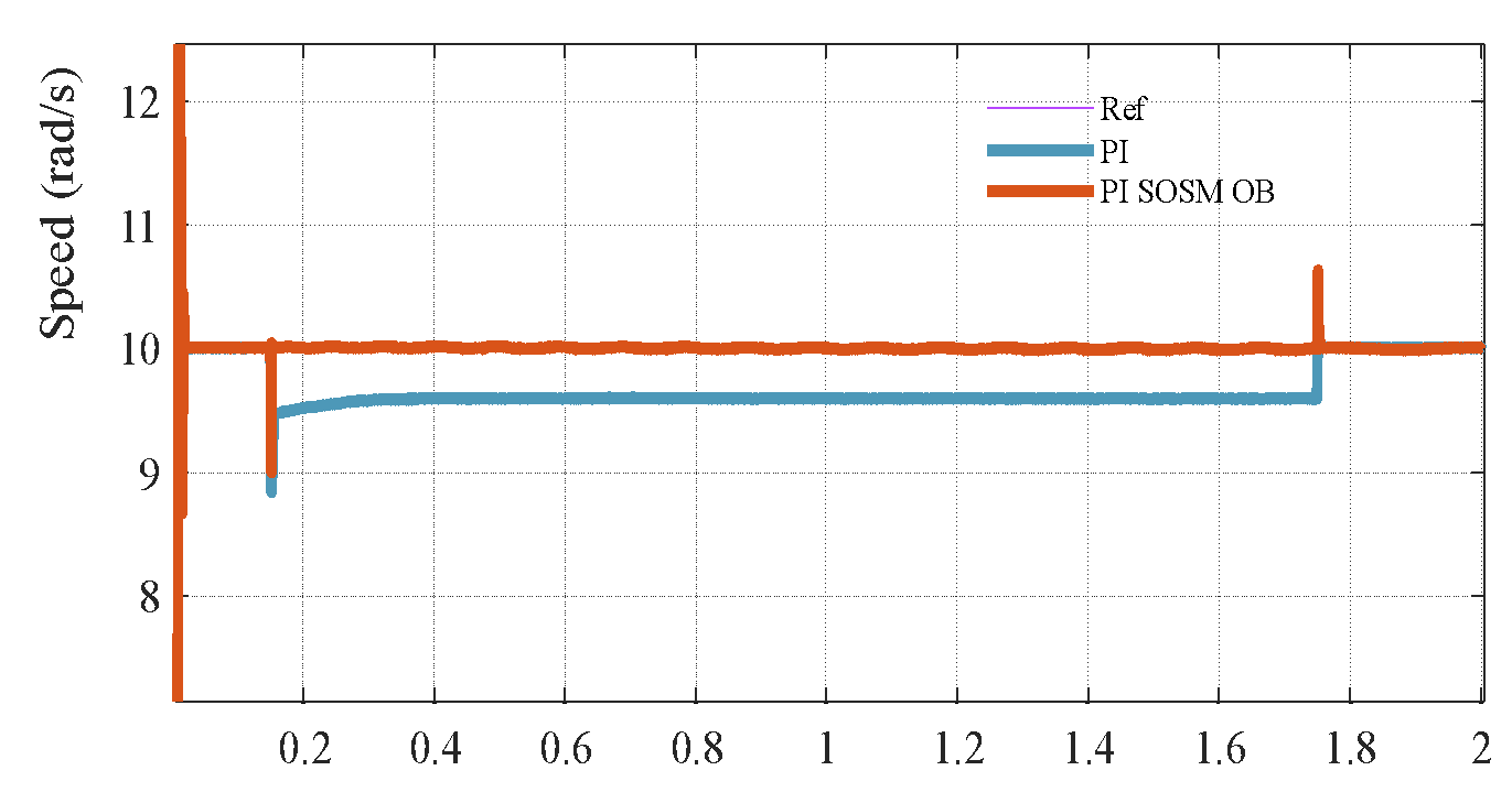 , and the closed-loop poles shift due to the change in mechanical dynamics. Specifically, the mechanical subsystem responds more sluggishly, leading to poor speed tracking and larger steady-state deviations during transient events. In contrast, the proposed PI–SOSM–Observer strategy maintains excellent dynamic performance despite the change in
