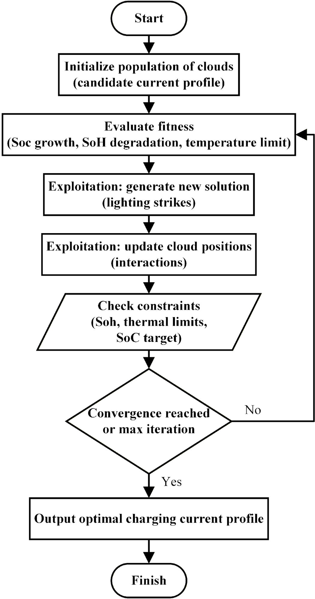 The TA optimization method uses an adaptive strategy in determining the charging current profile so that it can maximize the charging speed without exceeding the temperature limit and minimize battery degradation [19]. The TA introduces an adaptive control of charging current to maximize charging speed without violating thermal and health constraints. Unlike the simple random perturbation presented earlier, TA is based on the collective behavior of thunderstorm clouds. Each cloud represents a candidate charging current profile. Lightning strikes simulate exploration by generating new candidate solutions, while cloud movements represent exploitation, gradually converging towards regions of higher solution quality. This mechanism ensures that the current profile adapts to minimize degradation and maintain safe thermal limits, while still achieving rapid SoC growth.