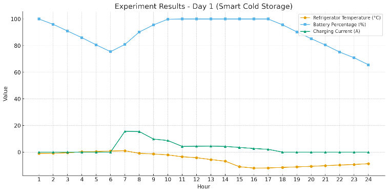At this stage, an experiment was conducted to test the performance of the FLC (Fuzzy Logic Control) method, which had been previously designed for the Smart Cold Storage system. The testing process involved applying the technique to a device integrated with the PLTS, collecting data on temperature control and battery capacity, and evaluating performance through analysis of relevant parameters. The study of the results involved comparing the system's response to different solar energy supply conditions and changes in cooling load, thereby determining the level of effectiveness and stability of the control method used. On the first day of the experiment, data were obtained with an average cold storage temperature of -5.49°C, an average battery level of 89.5%, and an average charging current of 3.8 A, which are fully shown in Table 3.