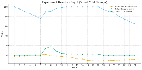 In Figure 7, the results of the second day's experiment show that the battery capacity dropped from 100% to around 76% in the morning, then returned to 100% at noon with a peak charge reaching ±18 A. The refrigerator temperature, initially close to 0 °C, dropped steadily to around -11 °C, indicating optimal cooling conditions. In the afternoon and evening, the battery's charge slowly decreased again to around 65% due to continued consumption without a solar power supply. These results indicate that the system can maintain an average battery charge of around 90% and regulate charging according to energy needs. Although this indicates stable daily operation, the term “stable” should be interpreted relative to the system's limits. The overnight battery discharge to approximately 65–75 percent indicates that the stored energy is sufficient for a single cloudy day but may be insufficient during prolonged periods of low irradiance. Thus, the stability observed in the 24-hour test represents short-term consistency rather than long-term energy autonomy. This limitation highlights the importance of future optimization through increased photovoltaic capacity or additional battery storage to ensure multi-day resilience under unfavorable weather conditions.