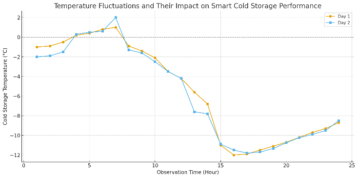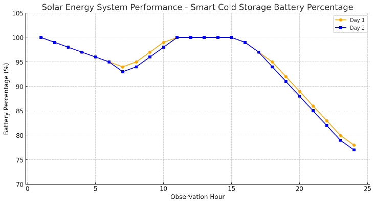Figure 11 shows the temperature fluctuations in the Smart Cold Storage on the first and second days during the 24-hour observation period. The temperature shifts from a range close to 0°C at the beginning of the observation period, then gradually decreases to around -11°C to -12°C by midday, before slowly rising again towards the end of the observation period. The slight difference between the first and second days indicates temperature fluctuations, but the system is still able to maintain the temperature within a range suitable for fresh fish storage. This demonstrates that despite temperature variability, the system's performance remains stable and effective. Larger fluctuations can occur if the solar energy supply is not optimal, for example, due to cloudy weather conditions. However, the efficient charging system, controlled by fuzzy logic, can compensate for these limited energy supplies, ensuring the cold storage continues to function correctly.