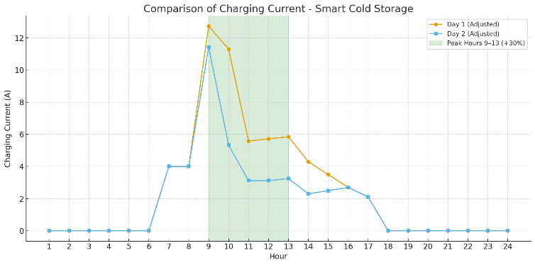 In Figure 10, a comparison of the Smart Cold Storage charging speeds shows that on the first day, the average charging speed reached 3.14 A, with a peak current exceeding 12 A in the time range of 09:00–13:00. Meanwhile, on the second day, the average charging speed was lower, namely 2.60 A with a peak of around 9–10 A. This difference illustrates that the system can adjust the charging process according to the available solar energy conditions and battery capacity. This adjustment not only maintains operational stability but also ensures power efficiency by preventing overcharging, thereby maintaining optimal energy utilization to support cold storage cooling. The observed difference in average charging currents between Day 1 (3.14 A) and Day 2 (2.60 A) can be primarily attributed to variations in solar irradiance conditions. On Day 2, the lower average charging rate likely resulted from intermittent cloud cover or reduced solar intensity during the morning hours, which limited photovoltaic output and consequently slowed the charging process. This behavior reflects the adaptive nature of the controller, which adjusts charging priorities in real-time according to energy availability. The finding confirms the system’s responsiveness to environmental fluctuations, yet also emphasizes the need for further evaluation under diverse weather scenarios to ensure long-term operational adaptability.