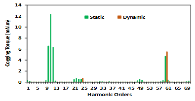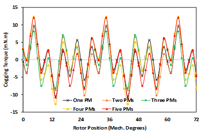 It is well known that all PM machines suffer from the cogging torque resulting from the interaction between iron and the permanent magnet. Such an inherent torque does not contribute to the desirable machine torque; however, it causes noise, vibration, and torque ripple. According to [31], cogging torque is a function of rotor position () and the smallest common multiple between stator slot and rotor pole numbers (), and it can be expressed as: