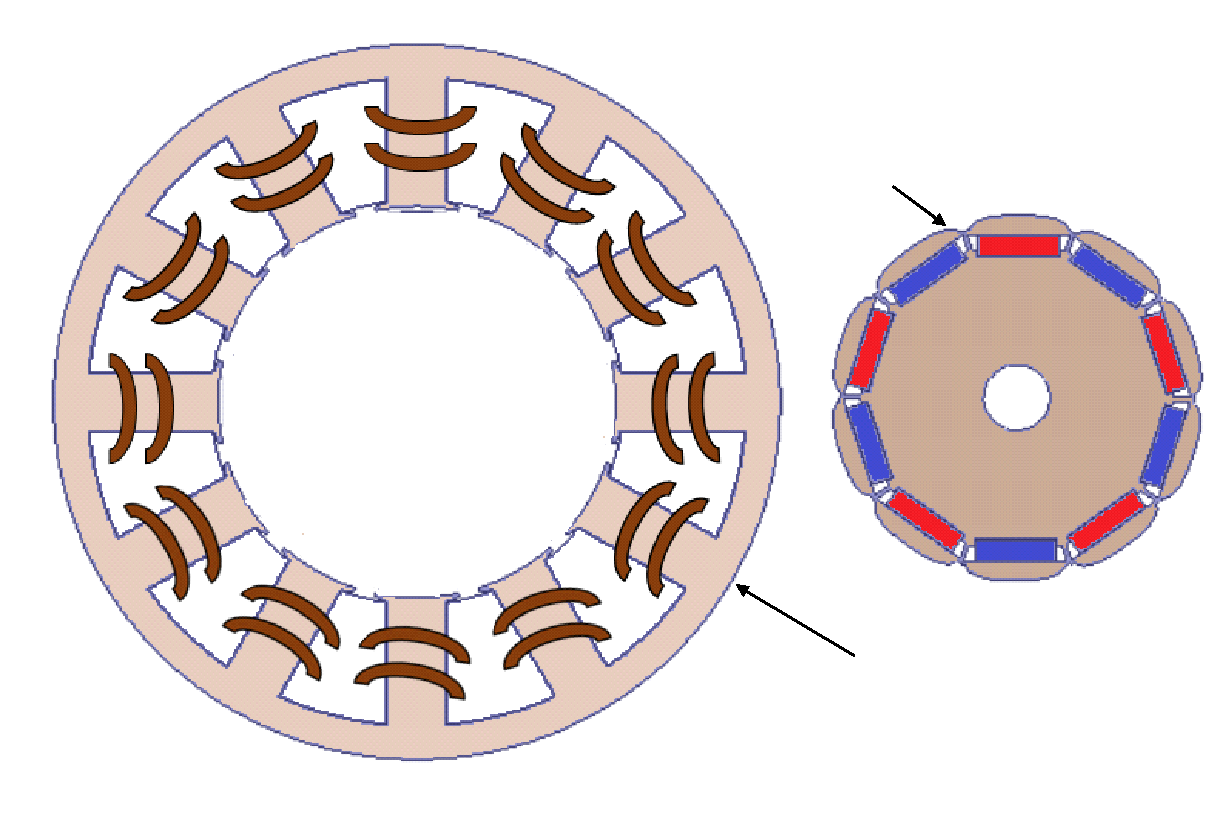 IPM motor with (12/10) stator/ rotor pole combination as illustrated in Figure 1. The rotor iron pole has been designed with sinusoidal + third ordered harmonic shape. At the same time, the stator has single-layer concentrated winding, which is preferable over other types since they have less copper usage, leading to efficiency improvement due to reduced copper losses.