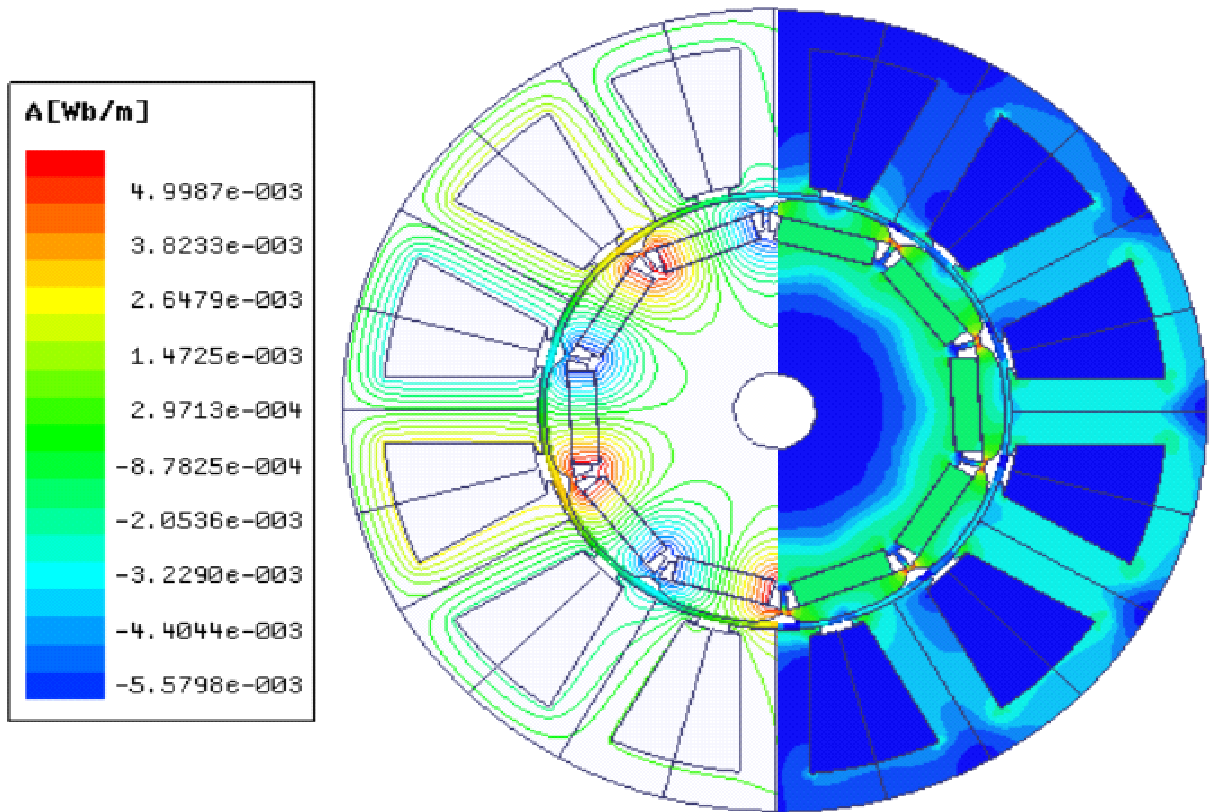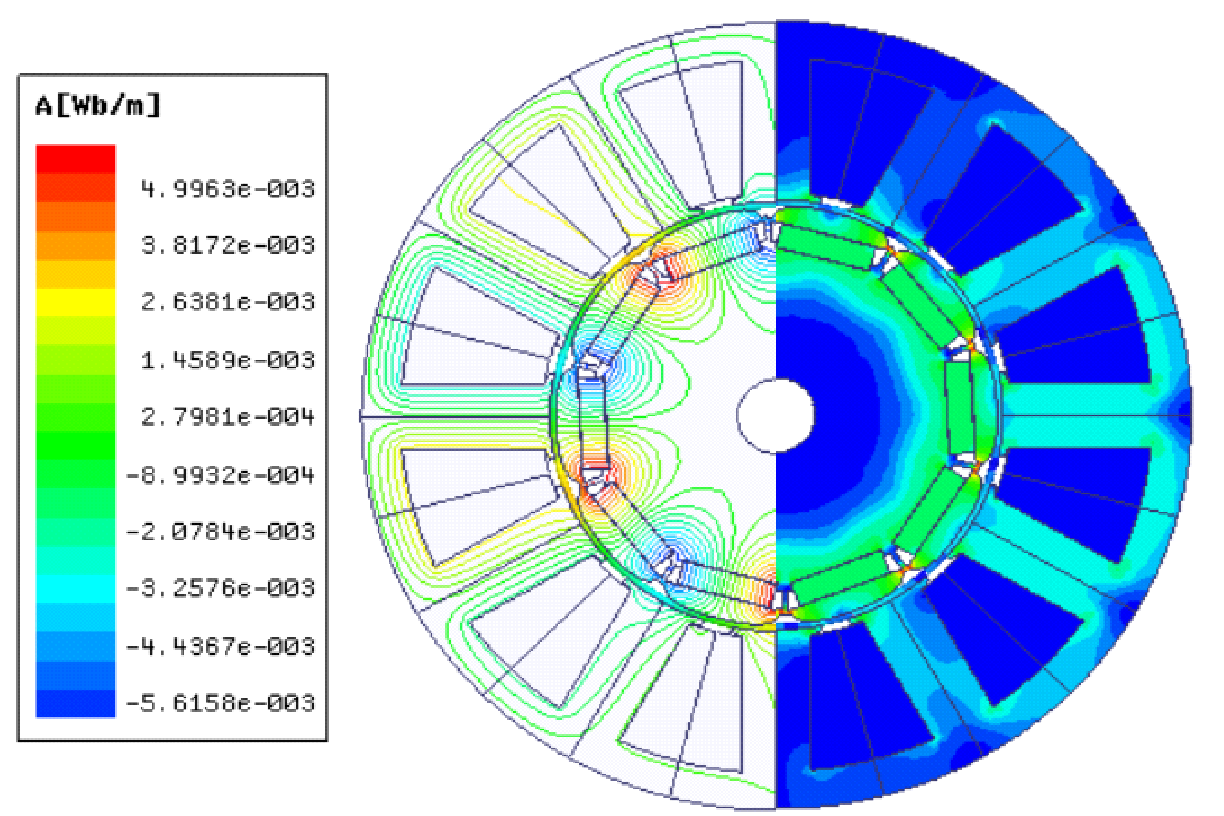 Figure 5 displays the machine's flux lines and flux density patterns with four different operation conditions: - healthy, PM diversity (the first case of Figure 2), static eccentricity, and dynamic eccentricities. The effect of the PM diversity and the eccentricities can be noted from the maximum flux value as shown in the Figure 5; the lower flux value is for the healthy machine, while the machine with diverse PM has the highest value, followed by the eccentric machine. This is because PM diversity was considered the maximum PM in this study. Br.