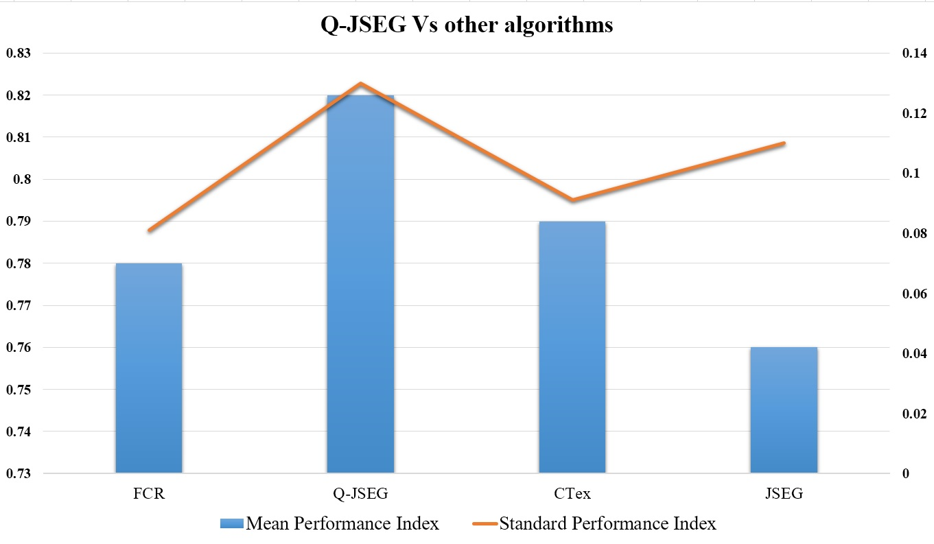 The comparative performance analysis of segmentation algorithms reveals that Q-JSEG achieves superior accuracy, while CTex demonstrates greater consistency across test images (Figure 9). Q-JSEG demonstrates superior segmentation accuracy as measured by its mean performance index, reflecting the effectiveness of its quaternion-based processing framework in handling complex color textures. In contrast, CTex shows more consistent results across different image types, evidenced by its standard performance index values. The conventional JSEG method serves as the baseline approach, against which the other two methods show measurable improvements. This comparative analysis highlights the inherent trade-offs between segmentation accuracy (Q-JSEG) and consistency (CTex), while demonstrating how quaternion mathematics can enhance traditional JSEG performance through improved color space representation and boundary detection capabilities. The results suggest that Q-JSEG is particularly suitable for applications requiring high-precision segmentation, while CTex may be preferred for more standardized imaging conditions where consistency is paramount.