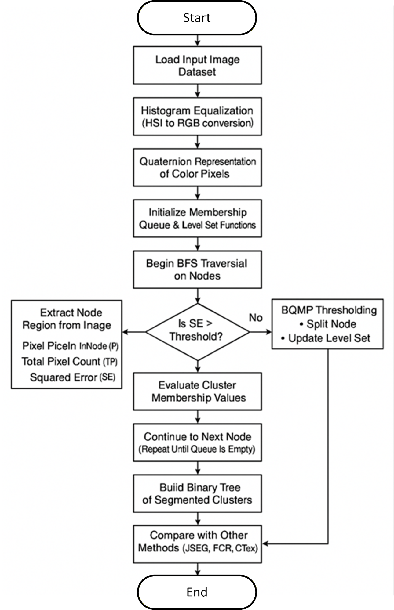 As illustrated in Figure 5 flowchart, the method integrates these improvements within the standard JSEG framework. The algorithm initializes a membership queue - a queue-based data structure that tracks region membership values throughout segmentation. Beginning with the root node (representing the original image with membership value 1), the process iteratively processes nodes in BFS order to construct a binary tree of color segments.