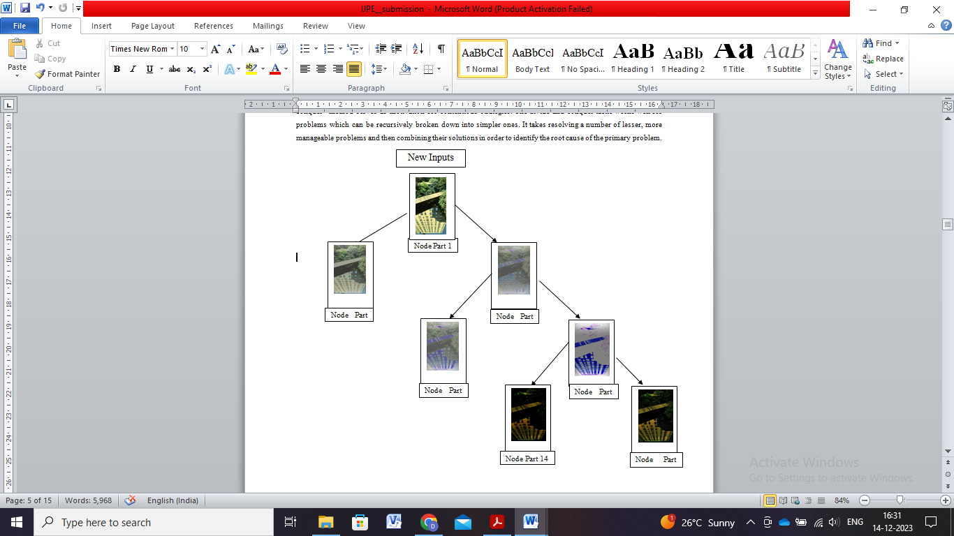 . Leaf nodes represent the final clusters. Figure 2 demonstrates this structure through a practical application of creating a shadow effect in a lake photograph. The visualization shows the original image as the root node with derived child nodes representing successive partitions, and final clusters formed at specific leaf nodes (nodes 2, 6, 14, and 15). This hierarchical representation provides systematic insight into the image transformation process, particularly in understanding how complex effects like shadows are computationally generated.