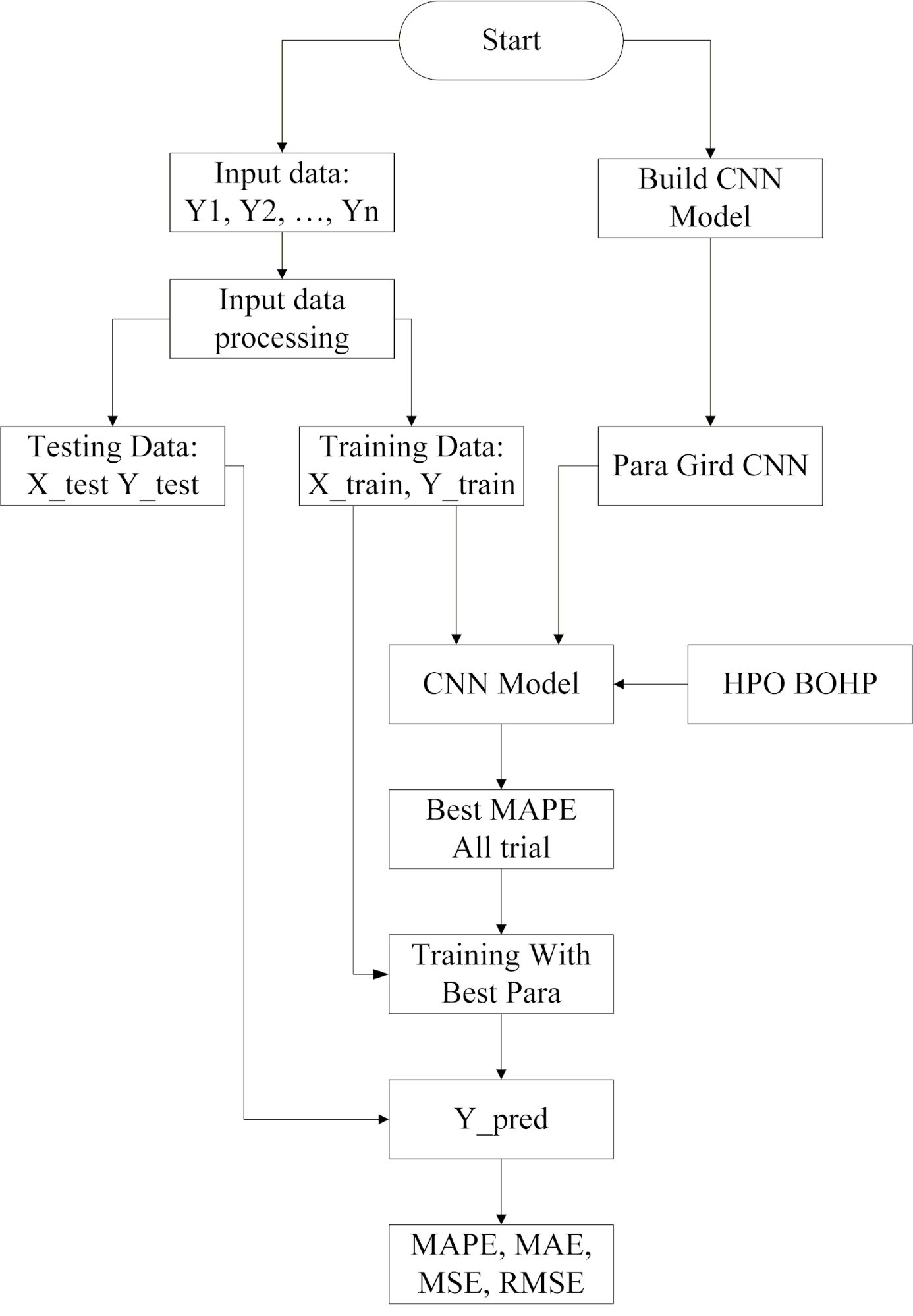 The CNN model is trained using the Adam optimizer with a fixed learning rate of 0.001. We adopt the standard Adam hyperparameters () and use the default Glorot uniform weight initialization for all parameterized layers, as provided by the Keras implementation. During training, we use the Mean Squared Error (MSE) as the loss function (or Mean Absolute Error – MAE – in some configurations) and monitor MAE or MAPE as additional evaluation metrics. The maximum number of training epochs is treated as a resource variable in the BO-TPE-HB search space (50–500 epochs), and the actual number of epochs used for each trial is jointly determined by Hyperband’s pruning strategy and the EarlyStopping callback, as detailed in Section “Hyperparameter Optimization Using BO-TPE-HB”. In our experiments, early stopping is applied by monitoring the validation loss and stopping training if no improvement is observed for 20 consecutive epochs, thereby avoiding overfitting and unnecessary computation.