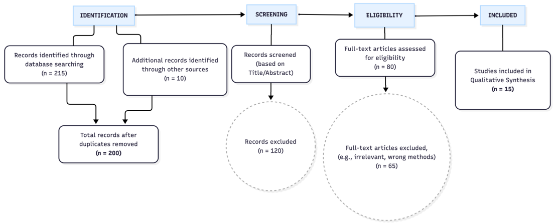 Figure 1 is a total of 215 articles were successfully identified from various databases in the early stages of the research. At this stage, a keyword network analysis was carried out using VOSviewer software to map topic clusters and identify dominant trends in the field of design informatics [35]. Furthermore, at the screening stage, as many as 120 articles were eliminated because their titles and abstracts were considered irrelevant to the focus of the research. The next stage is the feasibility test, in which 80 articles are analyzed through full-text review. At this stage, the exclusion criterion is applied to articles that do not discuss the technical implementation of the design, only review sociological aspects without visual relevance, or do not provide full-text access. After all these stages were passed, as many as 15 main articles were selected to be synthesized qualitatively. This number is determined as a representative sample through purposive sampling techniques, because these articles present specific and relevant data, such as discussion of pattern algorithms, branding case studies, and the development of narrative media that are in line with the research objectives [36][37].