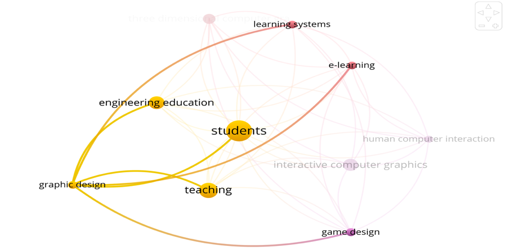 Computational mapping of keyword networks from the Scopus database (Figure 2) reveals a significant paradigm shift in graphic design research. The visualization shows a strong clustering between graphic design, engineering education, and interactive technology. As detailed in Table 1, the most frequent keywords were "Students" (20.7%) and "Teaching" (12.2%). From an informatics perspective, this dominance shows that current research does not only focus on aesthetics alone, but on the design of instructional systems and competency development within the engineering environment.