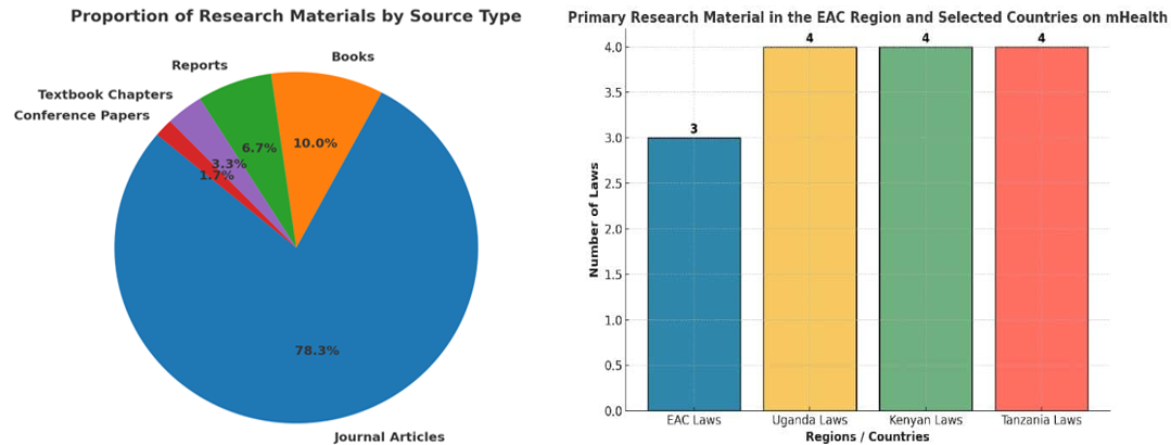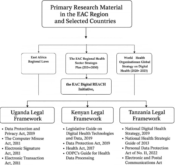 The study adopts a doctrinal method and the PRISMA (Preferred Reporting Items for Systematic Reviews and Meta-analyses) framework, which is the systematic process used to gather materials for the doctrinal legal analysis. The essence of adopting the PRISMA Guide is to ensure a comprehensive and unbiased identification of all relevant legal instruments and scholarly commentary, minimizing selection bias. Concerning this, the study relied on primary and secondary doctrinal research material. Hence, this entails a systematic search and selection, in addition to a critical appraisal, of several prior and existing legal, policy, and scholarly documentation about mHealth governance in the East African context. Hence, the study will consider national legal instruments, namely, constitutions, health sector acts, data protection acts, ICT regulations, and regional legal frameworks under the auspices of the East African Community (EAC) that may have relevance in integrating digital health. In this regard, data obtained from primary sources are therefore presented as follows in Figure 1.