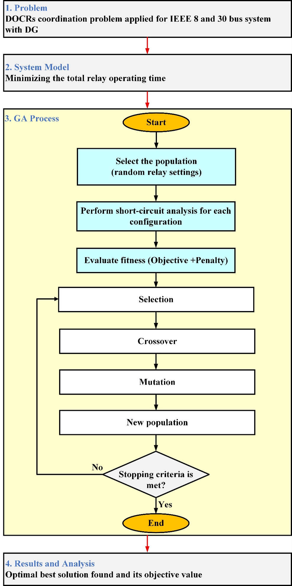 Although there are many ways to do this type of work, there are still many holes in what has been developed; Very few methods on the market today are set up to optimize each of the following three items; Pickup Current, PSM and Relay Characteristic Curve for each Network Configuration. Current approaches lack adaptability to real-time conditions, and many have not taken into account the Protection Blind Zone. These limitations led to the development of a proposed GA-based Combined and Adaptive DOCR strategy. The objectives of this strategy are to increase the effectiveness of coordinating efforts, reduce operating times, and improve reliability in an evolving Distribution Network environment (see Section 1.3 for additional detail).