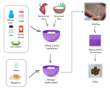 The production of flakes utilizing banana bud flour and arrowroot flour represents a significant advancement in high-nutrient food innovation. This research contributes to the utilization of agricultural waste to generate nutrient-dense functional flakes. Additionally, the flakes will undergo analysis of their physical and chemical properties to ascertain their nutritional composition. A sensory investigation will be performed to determine consumer preference for the flakes. Fruit residues serve as exceptional functional additives, enhancing or moderating organoleptic features such as odor, color, nutritional parameters, taste, and texture. Fruits provide nutritional advantages to the consumer while enhancing sensory attributes [59], [60].