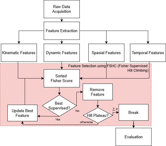 This chapter discusses the dataset and methodology used to diagnose dysgraphia, as depicted in Figure 1. The process begins with collecting raw data, which is then extracted into several types of features: kinematic, dynamic, spatial, and temporal. Afterward, the FSHC (Fisher-Based Supervised Hill Climbing) method is used to select the most relevant features. The selected features are used during training of the classification model to test their ability to recognize patterns. If the features achieve optimal performance, the process proceeds to the evaluation stage, using metrics such as precision, recall, and F1 Score. More specific explanations are outlined in each sub-chapter.