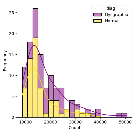 According to Figure 4(a), typically developing children typically show peaks at lower raw data values (around 10,000-30,000) and at higher frequencies. In comparison, the dysgraphia shows a broader distribution, peaking at higher values (around 10000-50000). The overlapping ranges in Figure 4(b) suggest that raw data does not distinguish between the two classes. The smoothed kernel density curve further highlights this difference, indicating that individuals with dysgraphia tend to have higher and more variable raw data values, suggesting the need for more detailed feature extraction and analysis to improve classification accuracy.