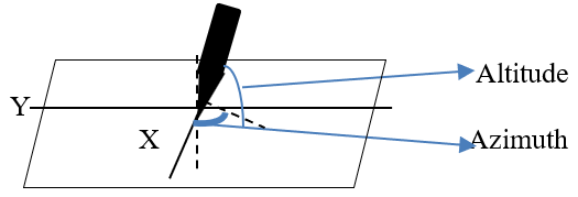 Dynamic features present the interaction of physical and sensorial aspects during writing [52]. It includes the parameters pressure, altitude, azimuth, and extreme local. Unlike kinematic features, which often contain many extreme outliers, pen orientation (altitude and azimuth) adapts to device characteristics rather than writing style. Therefore, granularization by percentile is unnecessary because the values tend to remain stable within a single writing task. Thus, there are only four derivative features, namely Mean, Maximum, Minimum, and Standard Deviation. Figure 3 shows the distributions of Altitude and Azimuth. Meanwhile, the local extreme is decomposed into nine sub-features because it is correlated with velocity and acceleration. In acceleration and velocity, local extremes show acceleration spikes (maximum) and a minimum on both. The temporal feature described the total duration, such as the time required to write [53]. The completion of a single segment is referred to as segment duration, while the total time until the end of the activity is called total duration. Total distance is also declared to measure the length of writing. In addition, Pen lift is measured as an on-air surface feature that calculates the time the stylus is lifted from the tablet surface.