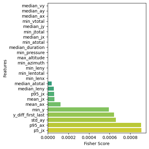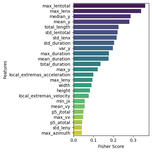 Figure 5 visualizes the 25 highest and lowest Fisher Score features. The Fisher Score is a measure used to assess how effective a feature is at distinguishing between target classes in a dataset. Features with higher Fisher Score values are considered more relevant in separating those classes. Features with high Fisher Score values can be the primary focus in model development. In contrast, features with lower scores may be less beneficial and can be considered for removal or lower weighting in further analysis. As in Figure 5(a), temporal and spatial features dominate, including the maximum total length (max_lentotal), the maximum length along the axis (max_lenx), and the median position on the