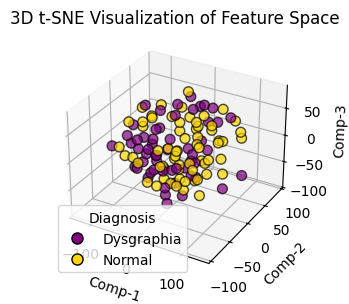 Further research is needed to improve FSHC performance. The proposed methods calculate Fisher fast but wrap the classifier in a loop, slowing system performance. Thus, the first further research is the optimization of the FSHC complexity. Future research should also investigate the impact of sample-wise preprocessing [63] and data refinement strategies in a non-ideal environment [64]. Additionally, the current binary approach limits the system’s clinical applicability by ignoring the severity of dysgraphia. Furthermore, the histogram shown in Figure 4 also presents the probability of expanding dysgraphia to a multi-class. The spatial and feature distribution visualizations show that the data cannot be strictly separated into two classes. Figure 4(a) shows the histogram of two skewed data groups, indicating intra-class statistics. The 3D component in Figure 4(b) also reveals the density of diagnostic labels, indicating heterogeneity and supporting the motivation to explore multi-class classification. This encourages multiclass classification research [65], which can potentially lead to imbalanced data in publicly available data [32]. Due to limited research on public access to datasets, as shown in Table 8, it is necessary to develop a diverse dysgraphia dataset with varied assignments and exploration of language use on the BHK test to improve model generalizability and robustness.