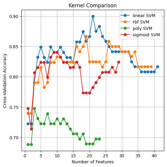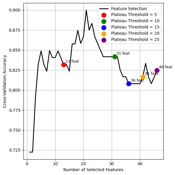 Figure 6 shows the hyperparameter observations, consisting of the plateau and the kernel used. Figure 6(a) shows the accuracy of FSHC, compared with the plateau threshold, when using SVM as the baseline supervision. Figure 6(a) shows that FSHC converges to a local optimum in 13 steps with a plateau threshold of 5. Setting the plateau threshold to 10 yields a global optimal with 31 steps and 21 best features (Figure 6(b)), whereas higher thresholds produce more steps and additional features without improving accuracy (Figure 6(b)). We compare the kernel used in the feature-supervision function with FSHC performance. Four kernels were compared: RBF, Polynomial, Sigmoid, and Linear, as shown in Figure 6(b). These test results indicate that Fisher-based Supervised Hill Climbing (FSHC) is highly dependent on the supervision function. SVM with a linear kernel consistently outperformed SVMs with RBF, polynomial, and sigmoid kernels. The second finding confirms that Fisher-Based Supervised Hill Climbing (FSHC) achieves superior performance in dysgraphia cases, supported by 21 optimal features dominated by spatial and temporal features, and an optimal plateau threshold of 10. It shows great potential for developing offline and online handwriting features, as most selected features correspond to spatial and temporal features. The combination of spatial and temporal features indicates the potential to create online and offline handwriting features in the future.