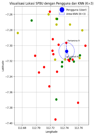 In the graph shown in Figure 5, PERTAMINA SPBUs are marked in red, Shell SPBUs in orange, and BP SPBUs in green. The KNN model (K=3) searches for the three nearest SPBUs from the user's location, represented by the blue circle. The distance between the user's point (the blue dot) and the SPBUs within the blue circle provides an indication of how close the chosen SPBU is to the user's location. The smaller the distance between the user and the SPBU, the more accurate the model is in selecting the nearest SPBU. The number of SPBUs within the blue circle is also important, as it represents the density of SPBUs around the user. If many SPBUs are within this area, the model has more options to choose from, making the selection more accurate. Conversely, if there are only a few SPBUs in the area, the model’s decision will be more limited. The colors of the SPBUs (red for PERTAMINA, yellow for Shell, and green for BP) indicate their proximity to the user. Red SPBUs (PERTAMINA) are likely farther from the user and become the furthest neighbor in the nearest neighbors set, while BP SPBUs (green) tend to be closer and may be more relevant for selection as the nearest SPBU. Shell SPBUs (yellow) might be in between, farther than BP but closer than PERTAMINA.