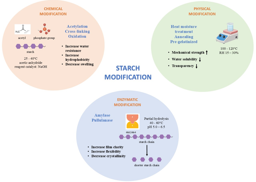To overcome these challenges, starch requires modification strategies that enhance its physicochemical, thermal, and mechanical characteristics. Starch can be modified using physical treatments (e.g., annealing, heat-moisture), chemical treatments (e.g., acetylation, oxidation, crosslinking), enzymatic methods, or blending with other biopolymers to improve its performance [17][18]. These approaches aim to reduce water sensitivity, enhance barrier properties, and increase the durability of starch-based films for food packaging.