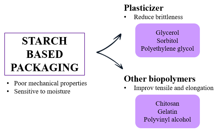Overall, improving the mechanical properties of starch-based films through modification, plasticization, and blending is essential for broadening their commercial viability in food packaging. These enhancements allow the films to meet industry standards while maintaining biodegradability and safety. Future research should continue to focus on optimizing the composition and processing conditions to achieve high-performance packaging materials with both functionality and sustainability.