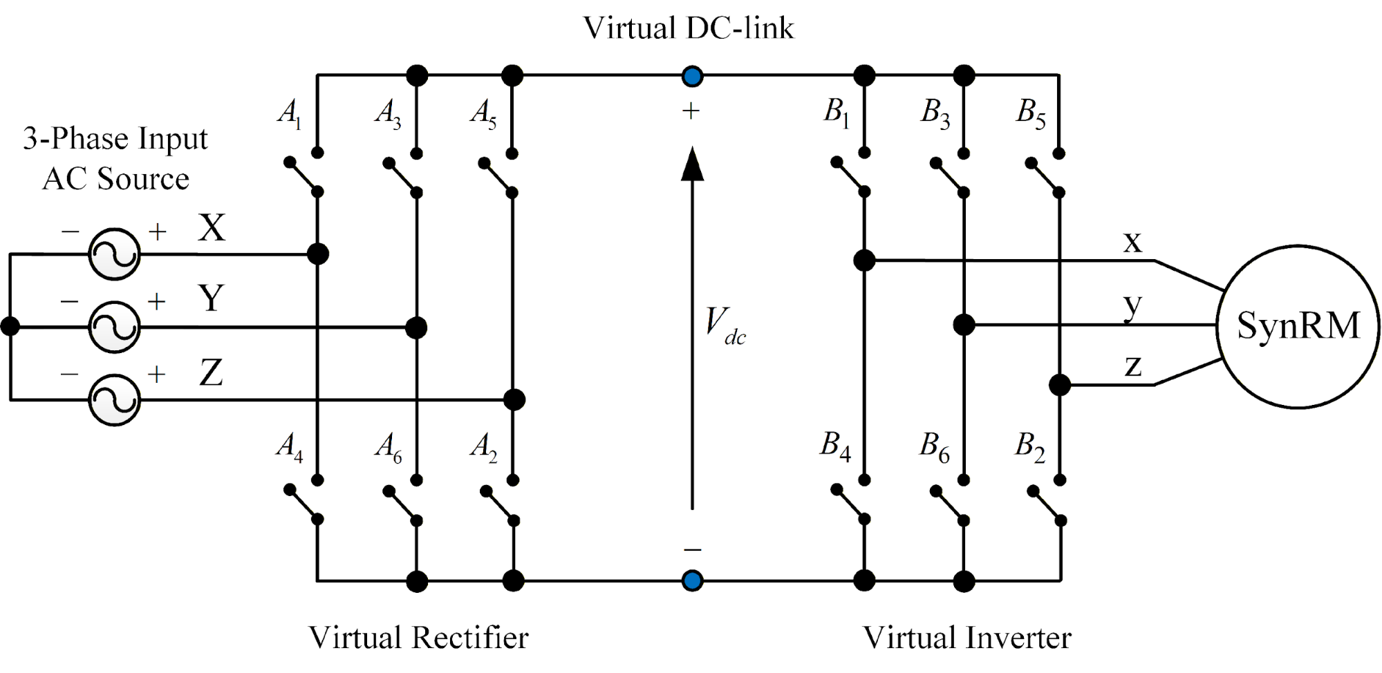 One of the common applications of matrix converters is in driving synchronous motors, specifically permanent magnet synchronous motors which have numerous benefits, including high power density and efficiency [31]-[35]. To achieve the best performance, matrix converters need advanced control schemes that can handle their complex switching behaviours and ensure stable operation of the synchronous motor. AC motors, including both induction and synchronous types, are essential in many industrial applications, including electric vehicles and robotics [36]. Combining matrix converters with synchronous motors creates a powerful synergy, resulting in drive systems with exceptional performance and energy efficiency [37]. In recent years, notable progress has been made in refining both the control strategies and design topologies of matrix converters used in synchronous motor drive applications. The matrix converter consists of actively controlled semiconductor devices and operates without the use of significant passive components. The minimization of passive components allows the matrix converter a topology primarily reliant on power semiconductor devices. Consequently, it offers exceptionally high power density, making it particularly well-suited for size and weight-sensitive applications such as aerospace, military systems, electric traction, and power distribution. The primary function of a matrix converter is to convert one AC voltage system to another, accommodating arbitrary amplitude, frequency, and number of phases [38]. To ensure bidirectional operation, matrix converters are built using bidirectional power semiconductor switches. However, the absence of magnets also makes synchronous reluctance motors a cost-effective alternative than permanent magnet synchronous machines [39].