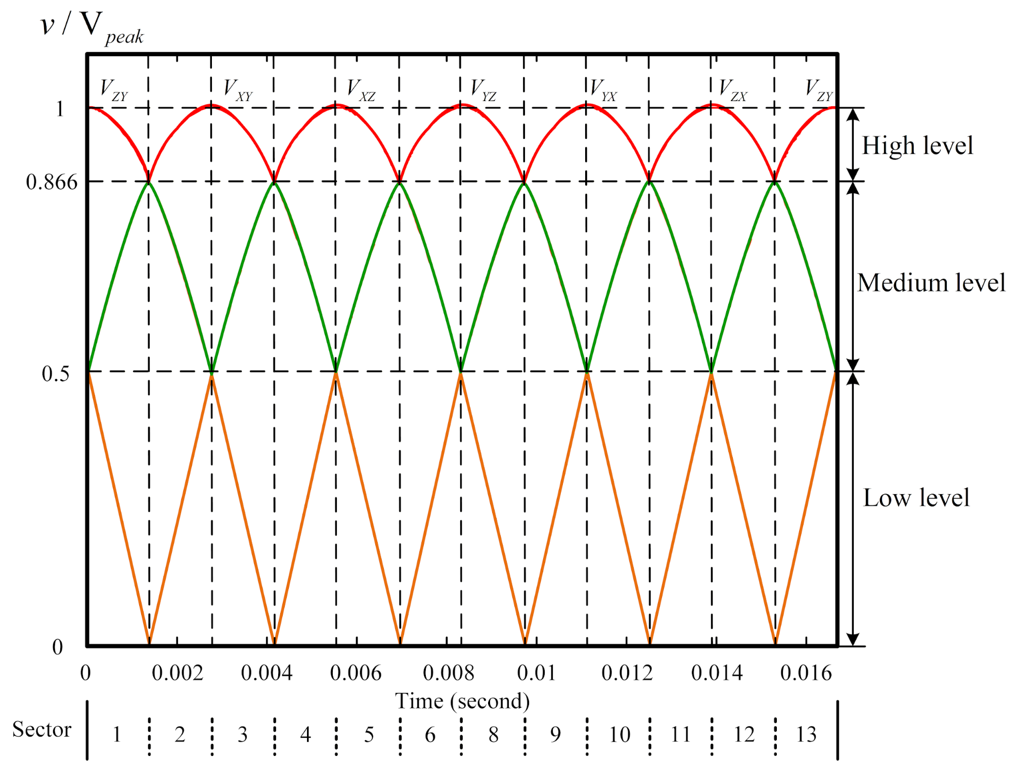 Equation (4) is the indirect switching pattern of matrix converter. During one voltage cycle, the virtual DC-link depicted in Figure 4 is divided into twelve distinct sectors. The highest voltage level is selected for each voltage source cycle, as it corresponds to the voltage level produced by a conventional diode-bridge rectifier.