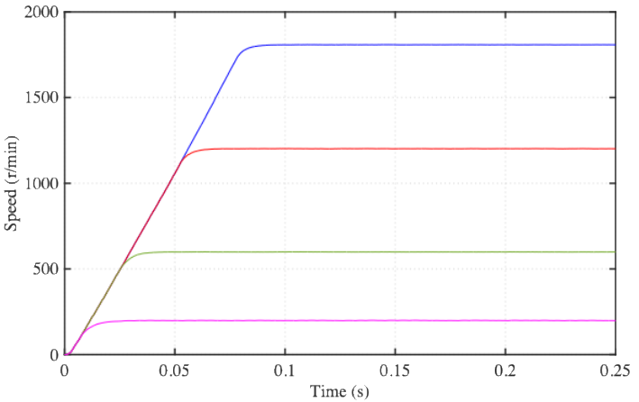 Figure 6 illustrates the transient responses of the SynRM speed drive system during acceleration from a low-speed range to the rated speed using step change input. Specifically, from 200 r/min to 1800 r/min, covering a wide operational range representative of typical industrial requirements. As evident from the simulation results, the proposed drive system exhibits satisfactory dynamic performance across the entire adjustable speed range. The motor speed closely follows the reference trajectory with minimal overshoot and rapid acceleration. The settling time is directly proportional to the magnitude of the speed command. As the speed command increases, the settling time becomes longer. At a low speed of 200 r/min, the settling time is approximately 0.02 s, whereas at the rated speed of 1800 r/min, the settling time increases to 0.7 s. Therefore, the overall settling time ranges from 0.02s to 0.7s, which can still be classified as a fast-settling response within the considered operating range.