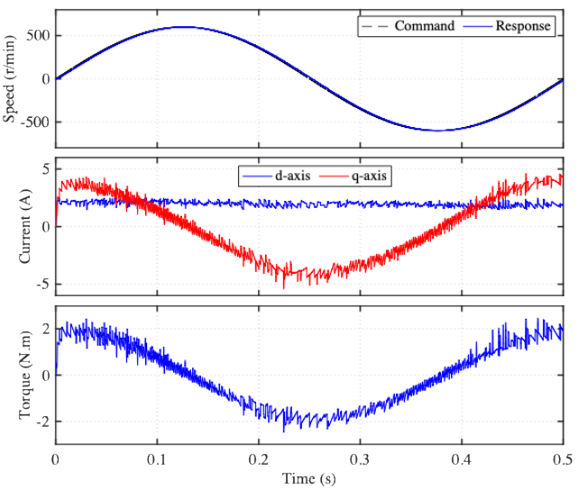 Figure 7 depicts the transient response of the proposed SynRM drive system under a reversed speed command scenario, where the reference speed is changed from 600 r/min to –600 r/min. This test performs the system’s ability to handle dynamic reversals in operating direction, which is critical for applications requiring frequent speed changes or regenerative braking. During the initial positive speed command of 600 r/min, the system exhibits a rise time of 0.023 seconds and a settling time of approximately 0.035 seconds, indicating a fast and well-damped response. When the reference speed is reversed to –600 r/min, the drive system maintains its performance, achieving a rise time of 0.060 seconds and a settling time of 0.069 seconds. Although the response to the negative command is slightly slower due to the inherent dynamics of direction reversal and the additional control effort required for deceleration and regeneration, the system remains stable and effectively tracks the new speed command without significant overshoot or oscillation. In addition, when reversed speed command, the SynRM must decelerate to zero before accelerating in the opposite direction, which introduces inertia-related delay. Then cost function in MPSC penalizes large control increments, preventing aggressive torque changes. This results in slightly longer settling time while maintaining stability. To further evaluate the tracking performance of the proposed drive system, a time-varying reference speed signal with a sinusoidal command at 600 r/min was applied in the